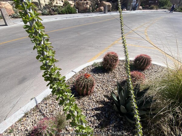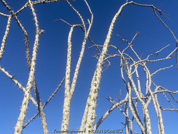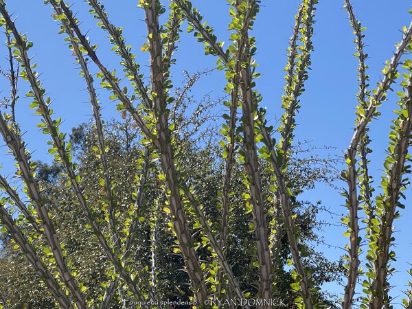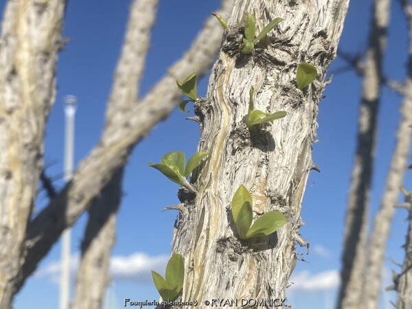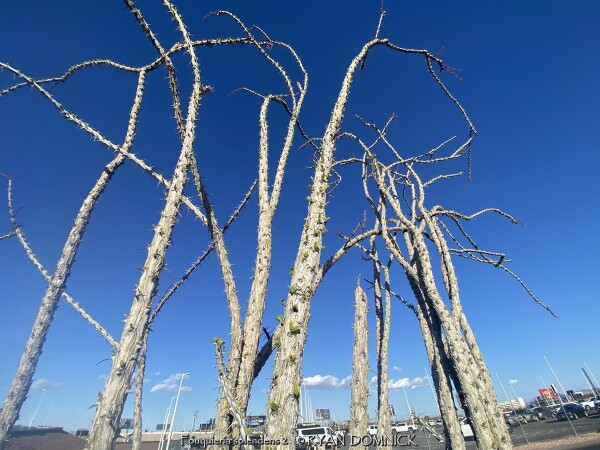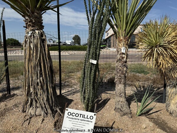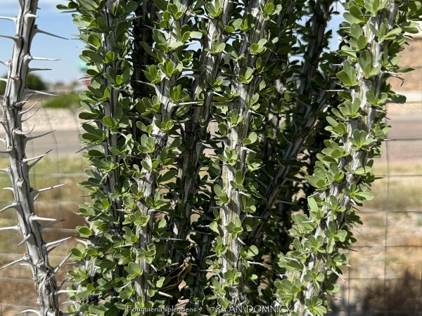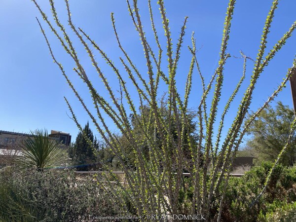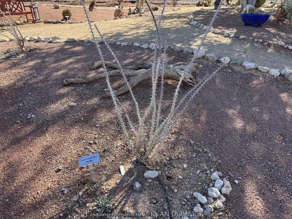 Ocotillo in also known as Fouquieria splendens Not a true cactus but more of a drought deciduous shrub, ocotillo is native to the Mojave desert south to the desert of Baja California, it's usually grown as a patio or house plant in Kansas. In the wild, established species are hardy to 10 degrees F. Grow in full sun with no extra watering except that which comes from rainfall. Repotting may or may not be needed depending on how large you want the plant to grow; plants can continue to grow taller and tolerate extremely root-bound pots but may need wind bracing. If repotting, make sure to use a sharp draining low organic cactus mix with plenty of sand and perlite. Potted plants are hardy to at least 25 degrees F for a short time if kept dry so you are ok if you miss the first light frost. Do not allow the pot with rootball to freeze solid though. Before extreme cold occurs, move to a bright interior window over the winter with no watering and keep above freezing. As a winter house plant, it will look presentable all winter long with just no waterings.(also to prevent lanky winter growth) As a permanent house plant, provide bright light and allow the soil to dry between waterings for many years of carefree enjoyment. Plants grown permanently indoors may begin to elongate stretching for light and lose their color. It can be hard to reproduce the intense UV sunlight they need so moving outside for the summer is best. Generally if moving outside for the summer, allow 1-2 weeks of part shade or morning sun before placing in full sun. Plants with time to acclimate will thrive in full sun but be careful not to rush it or sunburning will occur. Potted plants are very low maintenance.