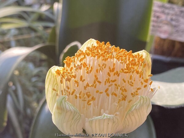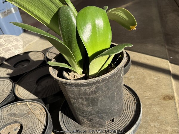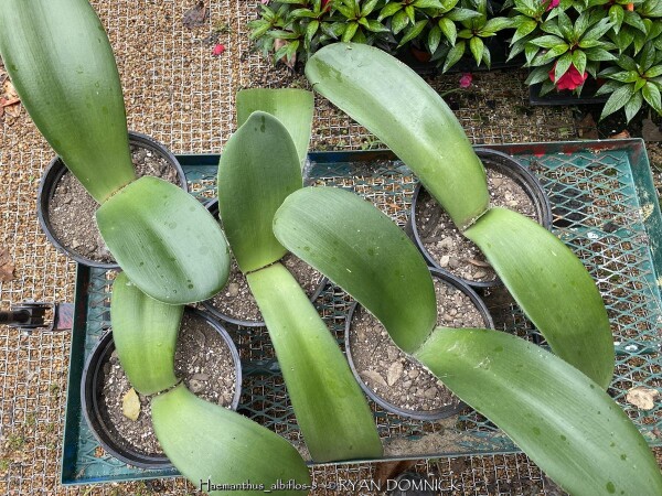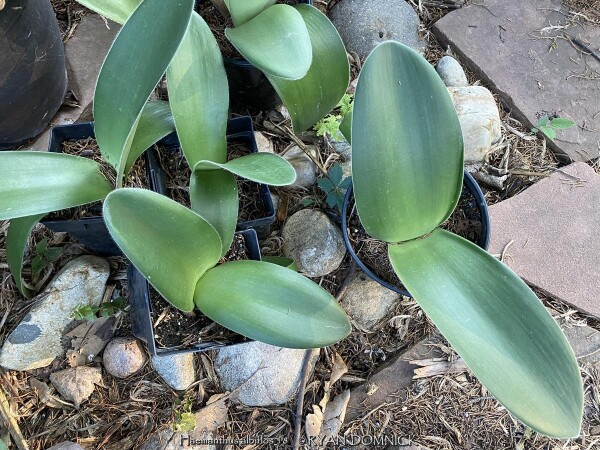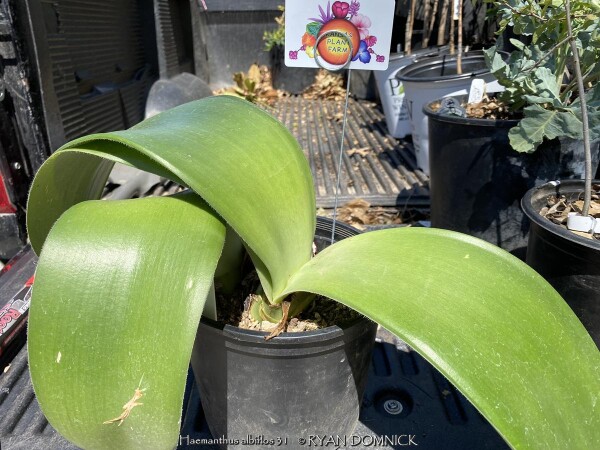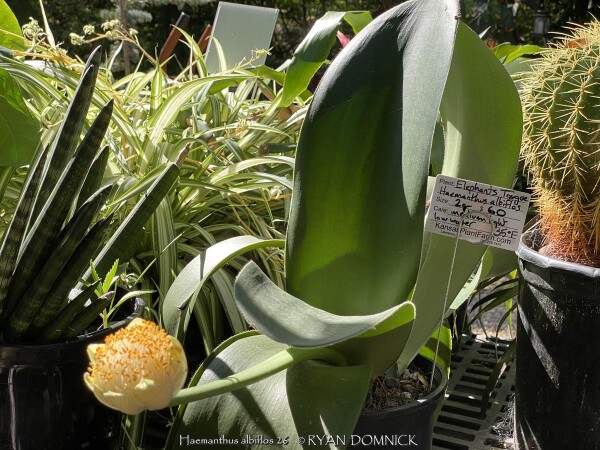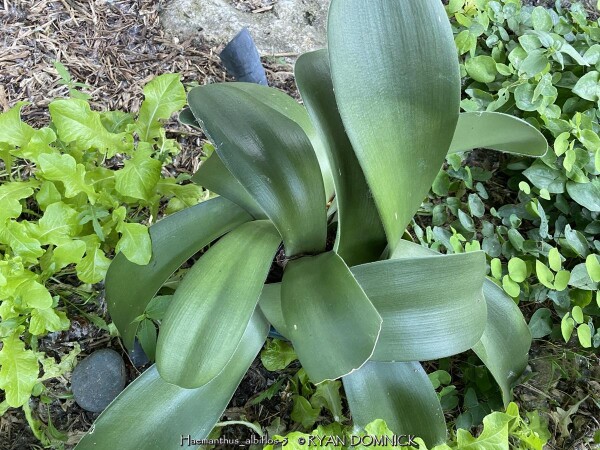 Elephant's Tongue Plant (Haemanthus albiflos) has attractive exceptionally wide medium green, wide, glossy, curved foliage along with occasional white flowers. It is native to seasonal semi-dry coastal cliffs in South Africa hardy to 23-25 degrees F. It is best used as a houseplant or summer patio plant in Kansas. Place in part to full shade in areas where occasional extra watering can happen including that which comes from rainfall. Repotting may or may not be needed depending on how large you want the plant to grow; plants can continue to grow thicker and tolerate extremely root-bound pots. Potted plants are hardy to at least 30 degrees F for a short time but try not to miss the first light frost. Move into a cold garage, basement, or bright window over the winter with occasional watering. Flowering is more reliable with root-bound plants but rarely occurs. As a winter house plant, it will look presentable all winter long with just a few waterings. As a permanent house plant, provide bright light and allow the soil to dry between waterings for many years (even decades) of carefree enjoyment. Potted plants grow very slow and are very low maintenance needing only old leaves removed once per year. Elephant's tongue is relatively rare and will command a higher price than most other houseplants.