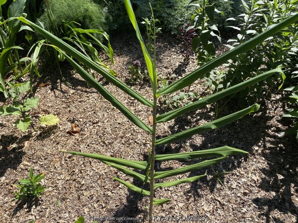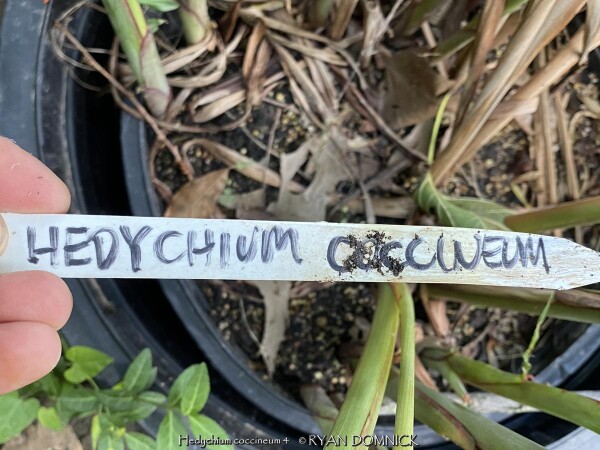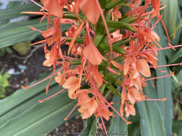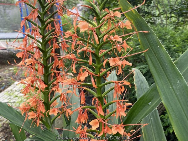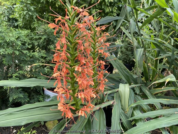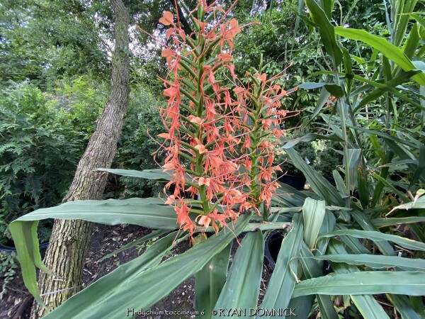 Hardy Ginger (Hedychium) are typically grown for their late summer flowers and vertical wide-leaf foliage. The plants are large tropical and subtropical herbaceous perennials with a rhizomatous rootstock native to areas with a summer monsoon and dry winter. They can be grown as flowering summer patio plants. If growing as a potted plant and trying to overwinter, allowing the foliage to frost is ok, it will not kill the root system. However, do not allow the pot with rootball to freeze solid or go below 20 degrees for more than a few hours; move into a cold garage or basement over the winter with no watering. Cut back and allow to go dormant and place entire pot back out in April or May with a time-release fertilizer. Another more labor intensive way to overwinter cannas is to remove them from the dirt, dust with fungicide, place in box with sawdust, and keep in the refrigerator. We consider this method old-fashioned and too much work but ok if you only want to save a few pieces. If digging from the ground, just save a big chunk with the dirt intact and place into a large pot in the garage. During the growing season, fertilize, water regularly, and place in full sun. You may also plant these in the ground for an enormous tropical effect! It is possible to overwinter these in the ground in Kansas by mulching 6-12" thick over deeply planted rhizomes. New growth may be slightly delayed but probably quick to regain full height. Native habitat for most hedychiums aligns well with our dry winters and warm humid summers. In our trial gardens in Lawrence, KS (zone 6a), we will be testing several varieties in 2022-2023. Famous plantsman, Tony Avent, owner of Plant Delights Nursery in Raleigh, North Carolina, advised us that hedychiums should survive fine here in the ground when mulched like cannas. Hedychium coccineum features orange flowers.