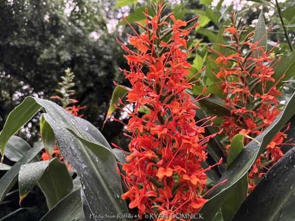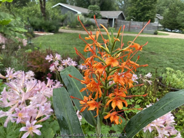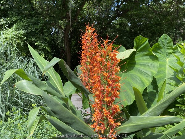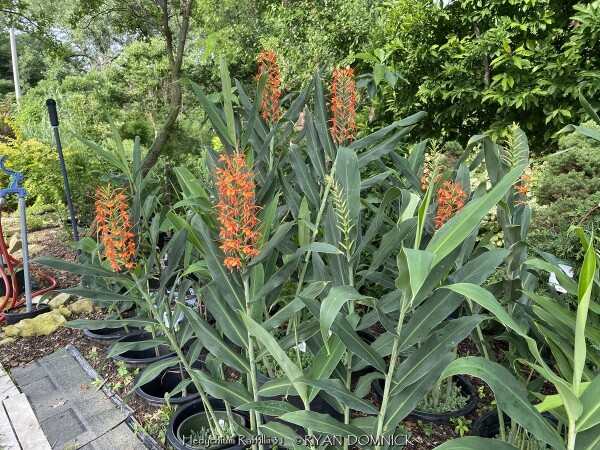 Hardy Ginger (Hedychium) are typically grown for their late summer flowers and vertical wide-leaf foliage. The plants are large tropical and subtropical herbaceous perennials with a rhizomatous rootstock native to areas with a summer monsoon and dry winter. They can be grown as flowering summer patio plants. If growing as a potted plant and trying to overwinter, allowing the foliage to frost is ok, it will not kill the root system. However, do not allow the pot with rootball to freeze solid or go below 20 degrees for more than a few hours; move into a cold garage or basement over the winter with no watering. Cut back and allow to go dormant and place entire pot back out in April or May with a time-release fertilizer. Another more labor intensive way to overwinter cannas is to remove them from the dirt, dust with fungicide, place in box with sawdust, and keep in the refrigerator. We consider this method old-fashioned and too much work but ok if you only want to save a few pieces. If digging from the ground, just save a big chunk with the dirt intact and place into a large pot in the garage. During the growing season, fertilize, water regularly, and place in full sun. You may also plant these in the ground for an enormous tropical effect! It is possible to overwinter these in the ground in Kansas by mulching 6-12" thick over deeply planted rhizomes. New growth may be slightly delayed but probably quick to regain full height. Native habitat for most hedychiums aligns well with our dry winters and warm humid summers. In our trial gardens in Lawrence, KS (zone 6a), we will be testing several varieties in 2022-2023. Famous plantsman, Tony Avent, owner of Plant Delights Nursery in Raleigh, North Carolina, advised us that hedychiums should survive fine here in the ground when mulched like cannas.
