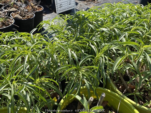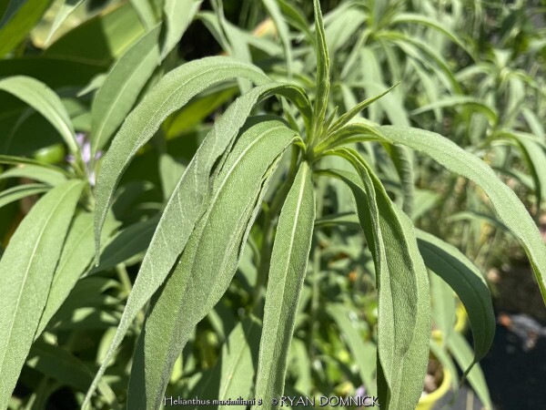 Maximilian's Sunflower is a very tall and showy wildflower native to the Great Plains in central North America and Canada. It has a distinctive fold down the mid-rib center of the narrow leaf. The leaf may be up to 12" long, slightly curved, and arranged in a whorl around the unbranching stems. In rich soils with average moisture, it reaches up to 10 feet tall and towers above surrounding vegetation when in bloom. In Eastern Kansas, typically our 40 inches of rainfall is sufficient without extra water. It is best suited for full sun and dry to medium soils to control height and to avoid floppiness. Like most other Sunflower species, Maximilian's Sunflower attracts a several different species of bees and butterflies. This species spreads by rhizomes and may spread too vigorously for most gardens, and therefore needs plenty of room. It is best used for naturalizing, roadway ditch plantings, buffer zones, or as as large isolated clumps. Cut or mow all foliage down in the winter, mowing around it during the growing season generally stops the yearly spread.