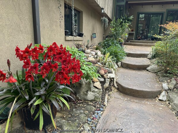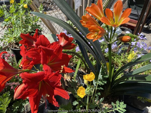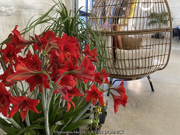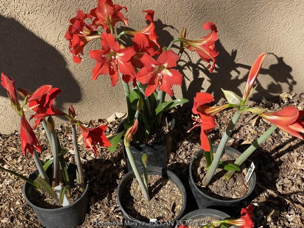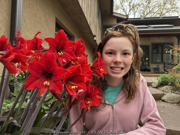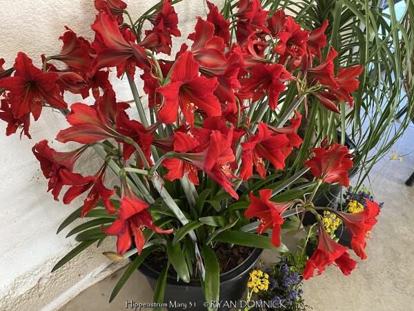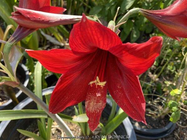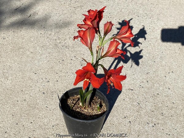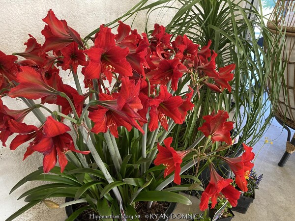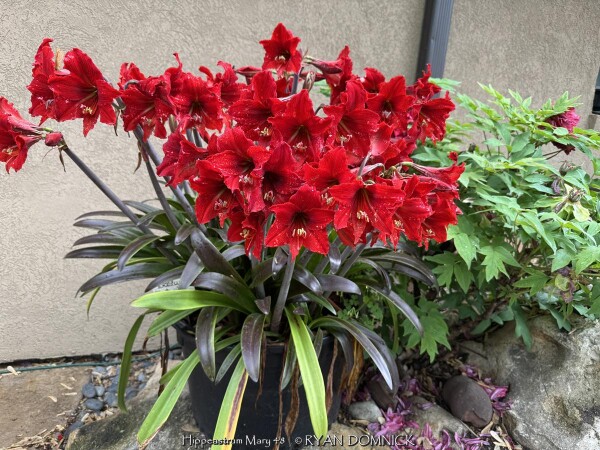 Mary's Hardy Red Amaryllis (Hippeastrum 'Mary') is a cultivar named by Ryan Domnick after his mother Mary. Mary Domnick had grown this beautiful unknown variety for over a decade in the 1980's and 1990's. The glossy green strap-like leaves emerge in spring emerge with a reddish tint. Deep red velvety flowers have a darker red throat and last for about a month. Foliage remains attractive all summer with plenty of heat tolerance. No other cultivars match this pure deep red color! The plants are temperate and subtropical herbaceous perennial bulbs native to areas with a summer wet season and dry winter. Mary's Hardy Red Amaryllis are hardy outside as a perennial when established and mulched at least to zone 6a. During the growing season, fertilize, water regularly, and plant in full sun. Plant these bulbs in the ground at least 6-8" deep with 3-4" of mulch to enjoy a wonderful tropical flowering effect! Trim back foliage after first fall freeze. They can also be grown as a flowering summer patio plant. If growing as a potted plant and trying to overwinter, allowing the foliage to frost is ok, it will not kill the root system. However, do not allow the pot with rootball to freeze solid or go below 20 degrees for more than a few hours; move into a cold garage or basement over the winter with no watering. Cut back and allow to go dormant and place entire pot back out in April or May with a time-release fertilizer. Another more labor intensive way to overwinter gladiolus is to remove them from the dirt, dust with fungicide, place in box with sawdust, and keep in the refrigerator. We consider this method old-fashioned and too much work but ok if you only want to save a few bulbs. If digging from the ground in colder zones, just save a big chunk with the dirt intact and place into a large pot in the garage. In our display garden in Lawrence, KS (zone 6a), several established specimens planted over 4-6" deep and mulched 2-3" with wood mulch survived -17 degrees F. During the arctic blast of February, 2021, lows down to -17 degrees F on Feb 16th, 2021 were recorded. The longevity of this cold blast was also impressive: 10 days on a row with highs of 10-15 degrees F or lower, 8 nights of lows in the single digits and negatives, and 36 straight hours of 0 degrees F and mostly lower. These have been in the ground for over 10 years and muscled through other periods of below zero cold weather.