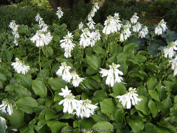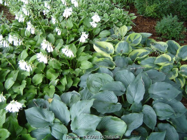 Hosta by far is the most popular and well-known shade plant in the United States. Many thousands of cultivars exist from original species native to China, Japan, and other forested areas in Asia. Hosta foliage arrises from a clump-forming root system and is often large and dramatic with many types of variegation. Flowers, born on tall stocks ranging in shades of white and purple, are equally attractive. Hostas grow best in rich, well-drained soils in full to partial shade. In Eastern Kansas with our average 40 inches of average rainfall, plants are drought tolerant if established in moisture-retentive high-quality soil. Dry-shade areas are best avoided. Afternoon sun with temperatures over 95 degrees F but likely burn the tips of hosta foliage rendering them unattractive for the rest of the year. There is no secondary growth by late summer after flowering and after buds have been set for next year. In northern parts of the country, hostas can handle full sun. In the Southern part of their range further South than zone 7, hosta can really struggle through the long summer heat unless conditions are perfect. Rabbits, deer, slugs, and snails can be a problem generally on small or un-established plants. Large-leaf robust varieties seem to outgrow browsing predators better than small dainty varieties. Methods of control are effective ranging from cages to deer repellents. Generally, a large established planting of hostas will be there for decades gradually getting thicker and denser without a need to divide. Many plantings have been in our display garden for 15-20 years with no weeds ever trying to grow in the shade of the foliage. Hosta foliage is susceptible to late spring freezes so try to cover if possible. During the Easter freeze of April, 2007, thousands of hosta were killed to the ground in eastern Kansas but all returned successfully by May from secondary buds. Hosta's newly unfurling foliage is considered edible when cooked like asparagus or eaten raw in salads. Hosta plantaginea 'Royal Standard' is an older variety that is very vigorous and tough. Robust clumps slowly spread over time. It features large glossy apple-green leaves with attractive ribbing under fragrant white flowers on 36" scapes. Very sun and drought tolerant.
