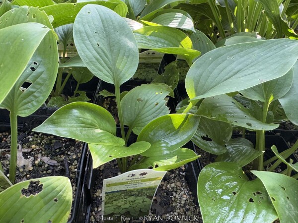Hosta by far is the most popular and well-known shade plant in the United States. Many thousands of cultivars exist from original species native to China, Japan, and other forested areas in Asia. Hosta foliage arrises from a clump-forming root system and is often large and dramatic with many types of variegation. Flowers, born on tall stocks ranging in shades of white and purple, are equally attractive. Hostas grow best in rich, well-drained soils in full to partial shade. In Eastern Kansas with our average 40 inches of average rainfall, plants are drought tolerant if established in moisture-retentive high-quality soil. Dry-shade areas are best avoided. Afternoon sun with temperatures over 95 degrees F but likely burn the tips of hosta foliage rendering them unattractive for the rest of the year. There is no secondary growth by late summer after flowering and after buds have been set for next year. In northern parts of the country, hostas can handle full sun. In the Southern part of their range further South than zone 7, hosta can really struggle through the long summer heat unless conditions are perfect. Rabbits, deer, slugs, and snails can be a problem generally on small or un-established plants. Large-leaf robust varieties seem to outgrow browsing predators better than small dainty varieties. Methods of control are effective ranging from cages to deer repellents. Generally, a large established planting of hostas will be there for decades gradually getting thicker and denser without a need to divide. Many plantings have been in our display garden for 15-20 years with no weeds ever trying to grow in the shade of the foliage. Hosta foliage is susceptible to late spring freezes so try to cover if possible. During the Easter freeze of April, 2007, thousands of hosta were killed to the ground in eastern Kansas but all returned successfully by May from secondary buds. Hosta's newly unfurling foliage is considered edible when cooked like asparagus or eaten raw in salads. Hosta 'T-Rex' is a giant. It forms absolutely huge clumps of blue-green leaves measuring 18" long and 14"wide! Wonderful puckering and deep veins add interest, a focal point for any garden. Near white flowers.