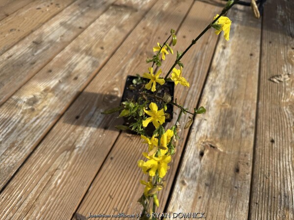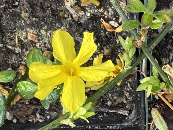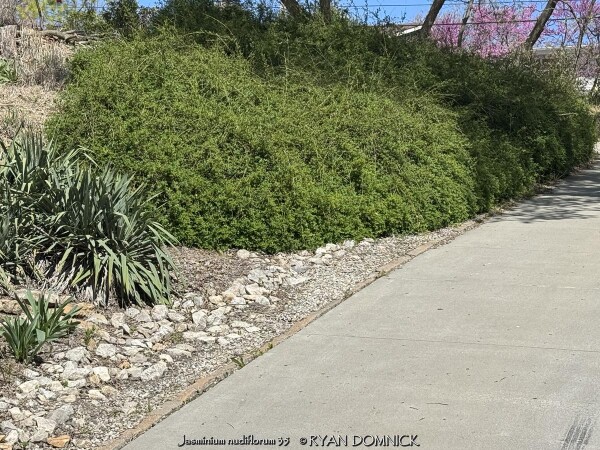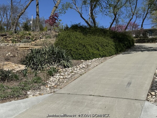 Winter Jasmine (Jasminium nudiflorum) is a spreading dwarf shrub native to China. It features dark green glossy leaves that remain attractive all summer. The density of the shrub overtime is unmatched, completely eliminating any weeds including tree seedlings from emerging. Bright yellow five-petaled flowers resembling forsythia bloom extremely early in the spring usually in February or March before foliage growth (in Lawrence, KS). Flower buds are hardy to about 0° so flowering may not occur every year if temperatures get lower. Occasionally this shrub will bloom in the middle of winter when we have a 2-3 week warm spell. When it does bloom, it creates a spectacular show completely covering the shrub. It will grow in full sun or full shade in medium to dry soils including some dry-shade. It tolerates moist soils and brief periods of saturated soils after heavy rains. Fall color is yellow but drops quickly. Stems take on an olive greenish color in winter rendering them mildly attractive. Winter jasmine is commonly grown as a spreading groundcover shrub for difficult areas, frequently used as large mass planting on hills. Because of its tolerance for adverse conditions including poor soil and rock, it is often one of the last resort plants that will survive in certain areas. It competes well under large shade trees and helps absorb leaf litter allowing it to break down and add nutrients back to the soil. This plant also does well in hot dry parking lot islands, hell strips, and along busy roads in full sun. Another great spot is planting on top of a retaining wall allowing it to cascade down. Further uses include erosion control and streambank stabilization. We do not recommend planting in small areas or in spaces that it will overrun neighboring plants. It only spreads above ground as horizontally growing stems touch the ground and root. This does make maintenance easier to control the spread of the plant versus digging out rhizomes. Avoid North exposures and wet soils. Considered one of the most versatile and best plants for solving difficult landscape challenges.