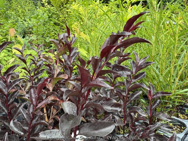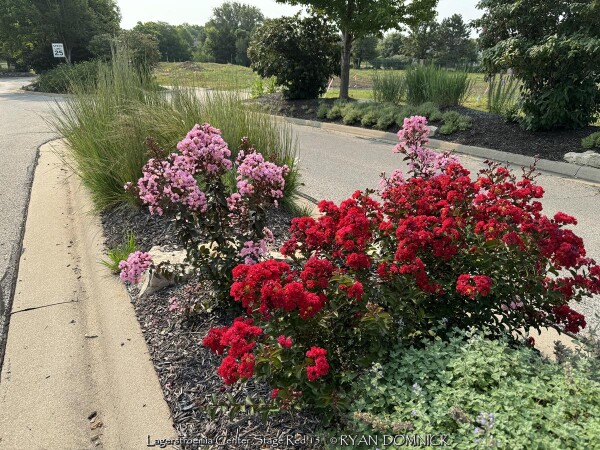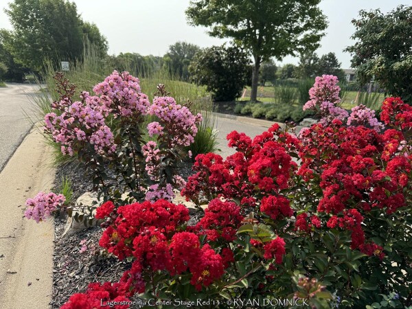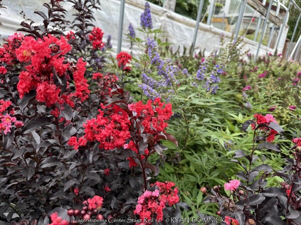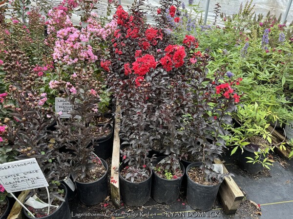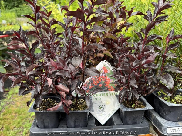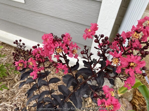 Crapemyrtle (Lagerstroemia) is a beautiful summer flowering shrub that dies down to the ground as a perennial each year in Zone 6 Kansas. Flower colors include bright red, pink, magenta, purple, and white. Many cultivars have been released improving foliage color, disease resistance, and flower blooming length. Newer cultivars now have maroon or reddish foliage adding interest before blooming. Beautiful fall color is often overlooked; shades of red, orange, and purple develop when Night temperatures reach into the 40s. In Kansas, crape myrtles grow best with hot south or west exposures or on south facing berms or hillsides. But they are suitable in any garden location as long as they are in full sun, they will build enough energy to come back from complete winter top-kill each year. Generally are 40 inches of rain per year is sufficient without extra watering, but if drought conditions occur, flowering will be reduced or shortened. Brief periods of excessive water and saturated soils are tolerated adding to their versatility. Many people from the south associate Crapemyrtles as a tree. That is true that in Texas and much of the Southeast, beautiful tree forms with exfoliating bark will occur because of mild winters. In Oklahoma and Arkansas for example crapemyrtles are usually grown as large shrubs experiencing major winterkill every 5-10 years. In Kansas and Missouri, or where temperatures regularly get to 0°, all top growth will die back and they will be grown as a woody perennial. After flowering and beautiful fall color is dropped, many people leave crapemyrtles throughout the winter to enjoy the winter interest of the dried seed heads. By March or April, cut plants close to the ground and watch for new growth. Flowering occurs on new wood and is much larger and more dramatic on sprouts from the ground. Flowers are often twice as big when grown this way. In the past, only fast-growing tree size cultivars for appropriate and Kansas because they have the ability to recover the fastest from complete winterkill and grow into a flowering-sized shrub by July. Now there are dwarf cultivars that are wood-hardy to -10 zone 6 for those not wanting to worry about winterkill. No disease or pest problems. Crapemyrtle are awesome for pollinators in the late season garden and especially effective when combined with vitex, butterfly bush, and/or caryopteris. Lagerstroemia 'Center Stage Red' is a new Proven Winners® release. This 3-5' shrub features deep black foliage and glowing red flowers; it truly will command center stage in your landscape. Note that this cultivar is wood hardy down to zone 6b. All Proven Winners® plants are legally propagated, healthy and vigorous, true to name, and tagged with color pictures and growing information.