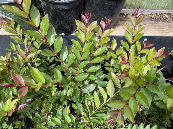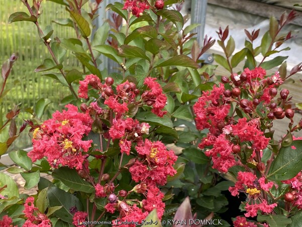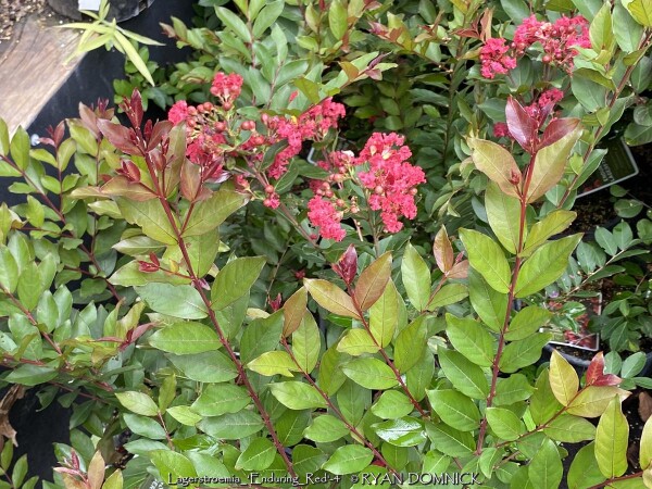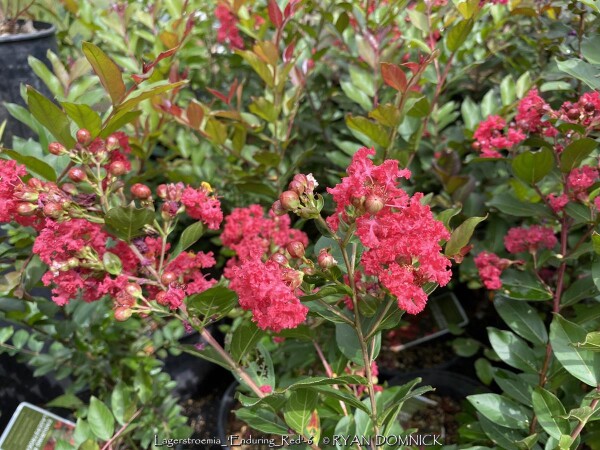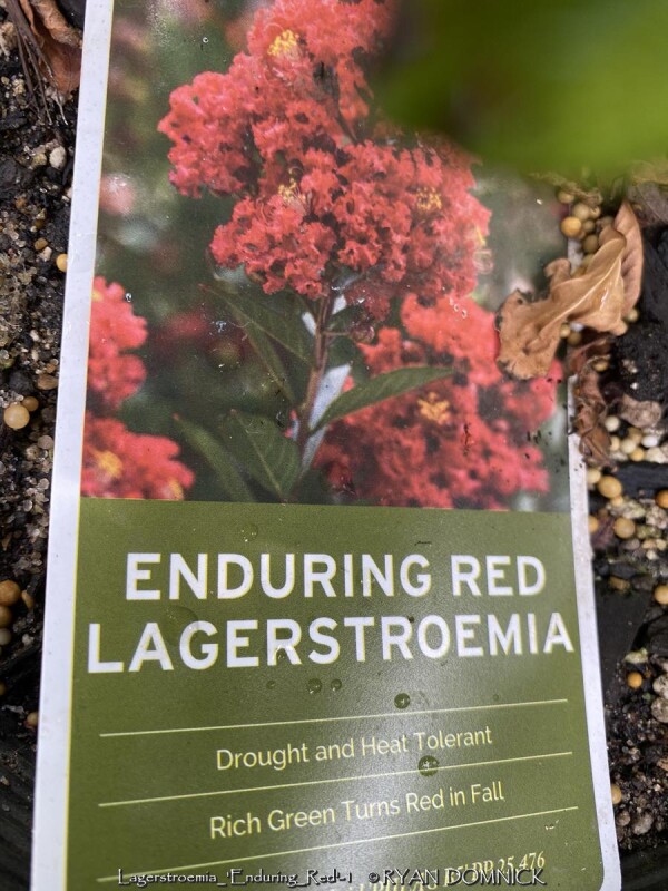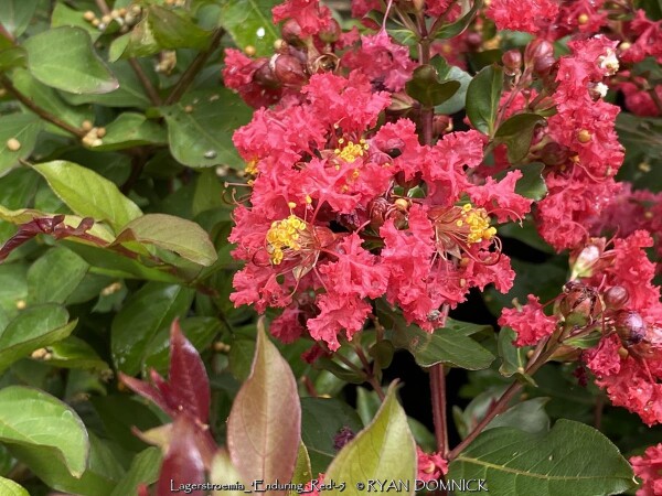 Crapemyrtle (Lagerstroemia) is a beautiful summer flowering shrub that dies down to the ground as a perennial each year in Zone 6 Kansas. Flower colors include bright red, pink, magenta, purple, and white. Many cultivars have been released improving foliage color, disease resistance, and flower blooming length. Newer cultivars now have maroon or reddish foliage adding interest before blooming. Beautiful fall color is often overlooked; shades of red, orange, and purple develop when Night temperatures reach into the 40s. In Kansas, crape myrtles grow best with hot south or west exposures or on south facing berms or hillsides. But they are suitable in any garden location as long as they are in full sun, they will build enough energy to come back from complete winter top-kill each year. Generally are 40 inches of rain per year is sufficient without extra watering, but if drought conditions occur, flowering will be reduced or shortened. Brief periods of excessive water and saturated soils are tolerated adding to their versatility. Many people from the south associate Crapemyrtles as a tree. That is true that in Texas and much of the Southeast, beautiful tree forms with exfoliating bark will occur because of mild winters. In Oklahoma and Arkansas for example crapemyrtles are usually grown as large shrubs experiencing major winterkill every 5-10 years. In Kansas and Missouri, or where temperatures regularly get to 0°, all top growth will die back and they will be grown as a woody perennial. After flowering and beautiful fall color is dropped, many people leave crapemyrtles throughout the winter to enjoy the winter interest of the dried seed heads. By March or April, cut plants close to the ground and watch for new growth. Flowering occurs on new wood and is much larger and more dramatic on sprouts from the ground. Flowers are often twice as big when grown this way. In the past, only fast-growing tree size cultivars for appropriate and Kansas because they have the ability to recover the fastest from complete winterkill and grow into a flowering-sized shrub by July. Now there are dwarf cultivars that are wood-hardy to -10 zone 6 for those not wanting to worry about winterkill. No disease or pest problems. Crapemyrtle are awesome for pollinators in the late season garden and especially effective when combined with vitex, butterfly bush, and/or caryopteris. Enduringtm Red Crapemyrtle (Lagerstroemia 'PIILAG B5') features clusters of bright true scarlet-red blooms appear all summer against the glossy green foliage. Leaves emerge red and turn to dark green. This mid-size variety grows 4 to 5 feet tall and wide with a tight growth habit. Developed by Greenleaf Nursery Company as part of the Garden Debut® Collection.