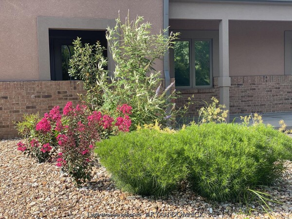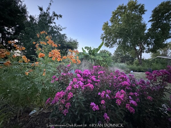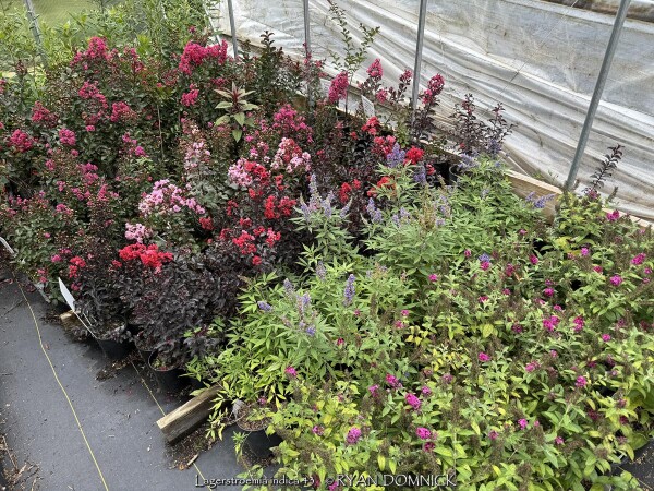 Crapemyrtle (Lagerstroemia) is a beautiful summer flowering shrub that dies down to the ground as a perennial each year in Zone 6 Kansas. Flower colors include bright red, pink, magenta, purple, and white. Many cultivars have been released improving foliage color, disease resistance, and flower blooming length. Newer cultivars now have maroon or reddish foliage adding interest before blooming. Beautiful fall color is often overlooked; shades of red, orange, and purple develop when Night temperatures reach into the 40s. In Kansas, crape myrtles grow best with hot south or west exposures or on south facing berms or hillsides. But they are suitable in any garden location as long as they are in full sun, they will build enough energy to come back from complete winter top-kill each year. Generally are 40 inches of rain per year is sufficient without extra watering, but if drought conditions occur, flowering will be reduced or shortened. Brief periods of excessive water and saturated soils are tolerated adding to their versatility. Many people from the south associate Crapemyrtles as a tree. That is true that in Texas and much of the Southeast, beautiful tree forms with exfoliating bark will occur because of mild winters. In Oklahoma and Arkansas for example crapemyrtles are usually grown as large shrubs experiencing major winterkill every 5-10 years. In Kansas and Missouri, or where temperatures regularly get to 0°, all top growth will die back and they will be grown as a woody perennial. After flowering and beautiful fall color is dropped, many people leave crapemyrtles throughout the winter to enjoy the winter interest of the dried seed heads. By March or April, cut plants close to the ground and watch for new growth. Flowering occurs on new wood and is much larger and more dramatic on sprouts from the ground. Flowers are often twice as big when grown this way. In the past, only fast-growing tree size cultivars for appropriate and Kansas because they have the ability to recover the fastest from complete winterkill and grow into a flowering-sized shrub by July. Now there are dwarf cultivars that are wood-hardy to -10 zone 6 for those not wanting to worry about winterkill. No disease or pest problems. Crapemyrtle are awesome for pollinators in the late season garden and especially effective when combined with vitex, butterfly bush, and/or caryopteris.