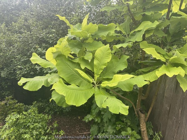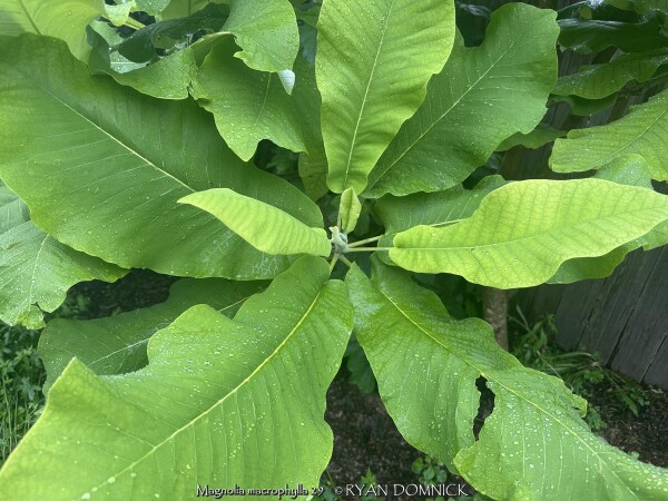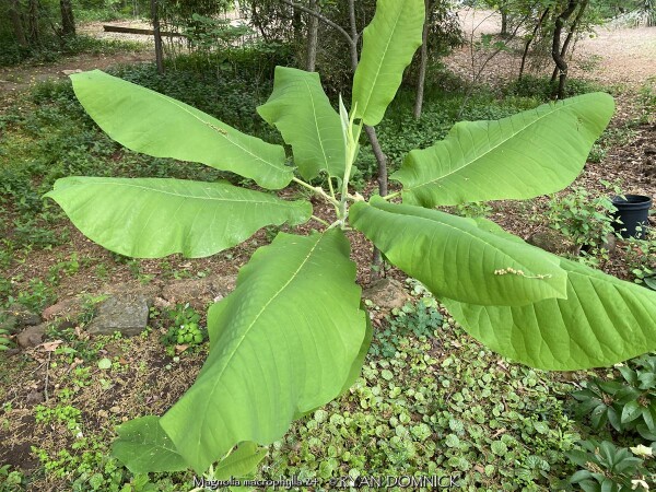 Bigleaf Magnolia (Magnolia macrophylla) features very large light green leaves that are the biggest simple leaf in North America measuring upto 36" long! They are native to pockets of the Appalachian mountains with perfect rich soils and protected from winds. One would think that plant like this would not do well in Kansas landscapes. However if given a little bit of wind protection, some watering, and decent soil, these trees will do fine and grow vigorously growing in sun or shade. Big leaf magnolias also produce large creamy white flowers and have silvery backs to their leaves adding to the appeal. With ideal conditions, a growth rate of 1 to 2 feet per year is possible. With more difficult conditions they will grow a few inches per year but still look attractive. There seems to be no other plant that can add a tropical feel like big leaf Magnolia. Magnolias in general are a family of plants that have been around for millions of years and are among the most primitive of all flowers. In fact, most magnolia flowers evolved before bees and are thus pollinated by beetles. Magnolias generally have no serious pests or diseases.