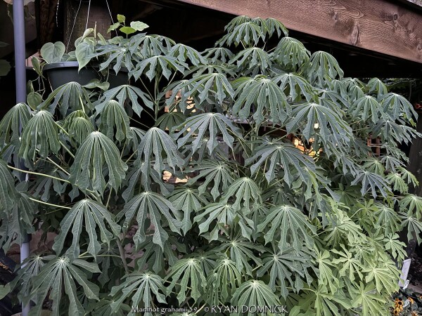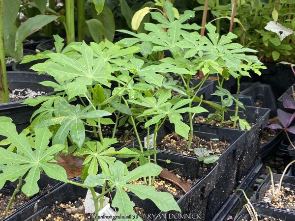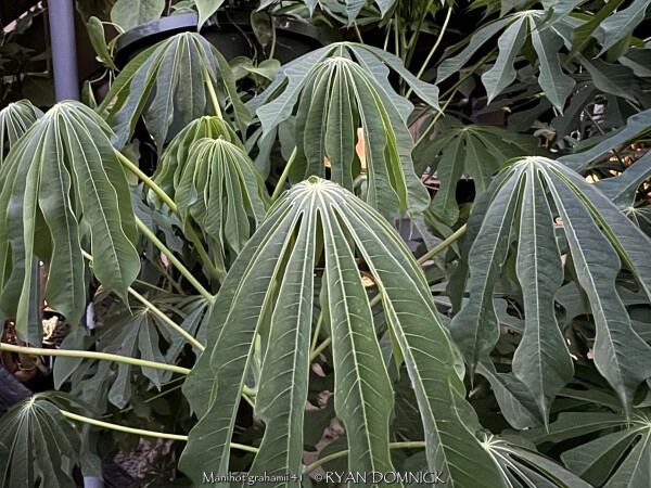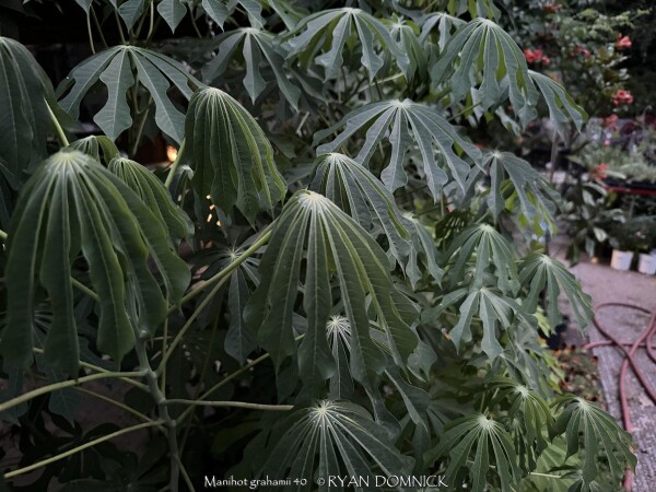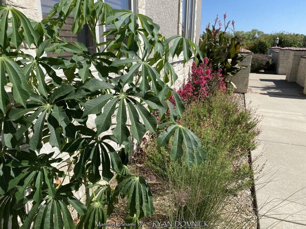 Hardy Tapioca (Manihot grahamii) is typically grown in warmer zones as a shrub or tree in the family Euphorbiaceae native to South America. Along with other tropicals and succulents in Kansas, hardy tapioca is usually grown as summer patio plant with amazing artistically whorled green leaves and small yellow flowers loved by bees. Water regularly and place in full sun or part shade. Protect from temperatures below 20 degrees F and move into a cold garage or basement over the winter with minimal watering. Do not allow the pot with rootball to freeze solid or go below 15 degrees for more than a few hours. Allow to go dormant as needed with little care, just cut off dead foliage/twigs and place back out in April or May with a time-release fertilizer. You may also propagate this plant easily by cutting off dormant twigs/branches and stuffing them into the ground. Notice that I didnt say rooting hormone or even being carefull was necessary! Landscapers also plant these as an annual in the ground for an enormous tropical effect with growth reaching 5-8' in one season from a 1gal container! It is possible to overwinter Manihot grahamii in the ground in Kansas as a woody perennial. In our trial gardens in Lawrence, KS (zone 6a), a one year established specimen planted on the South side of a house protected from winter moisture and mulched 12" thick with leaf mulch survived -17 degrees F. During the arctic blast of February, 2021, lows down to -17 degrees F on Feb 16th, 2021 were recorded. The longevity of this cold blast was also impressive: 10 days on a row with highs of 10-15 degrees F or lower, 8 nights of lows in the single digits and negatives, and 36 strait hours of 0 degrees F and mostly lower.