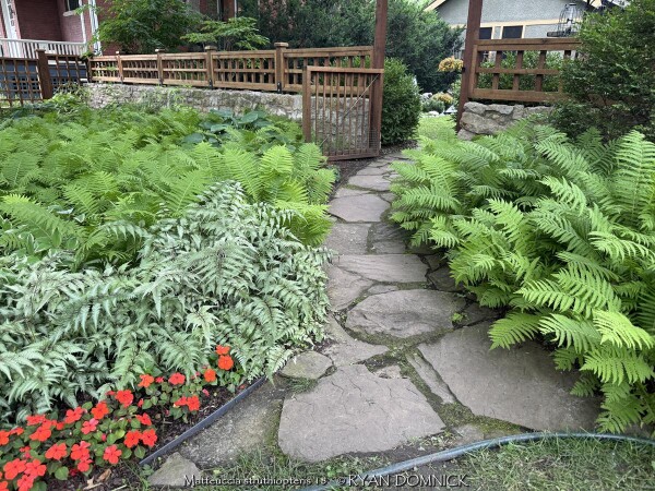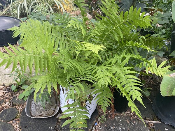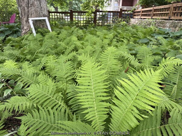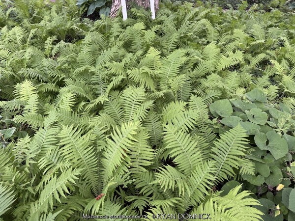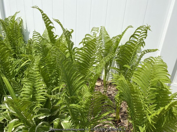 Ostrich Fern (Matteuccia struthiopteris) is planted for its graceful long bright green fronds reaching up to 3' in cultivation. Foliage maintains well all summer provided that certain cultural conditions are met. Native to eastern North America, Europe, eastern Asia, eastern North America, it colonizes forests and can be aggressive in ideal locations but not so much in Kansas. It can spread rapidly in humusy, medium well-drained soil in part shade to full shade. It cannot handle prolonged Kansas droughts or dry-shade. Foliage will flatten to the ground during breif drought then spring back up when moisture is available again. Generally however, in non-irrigated or poor soil areas, this plant will decline and allow weeds to invade. Perfect in wet shade areas, north walls, areas without tree-root competition, or shaded rain gardens. Ultra cold-hardy plants from northern climates normally dislike our long hot humid summers; although we are on the Southern edge of this plants adaptability, it still survives reasonably well here. Look for a cold microclimate planting location such as East or North exposure.