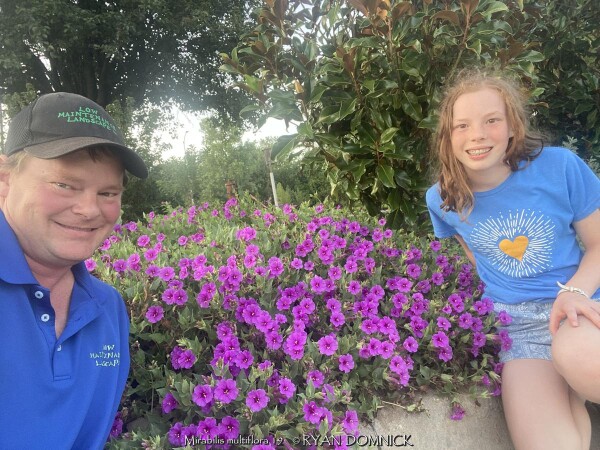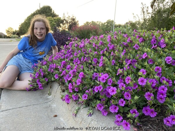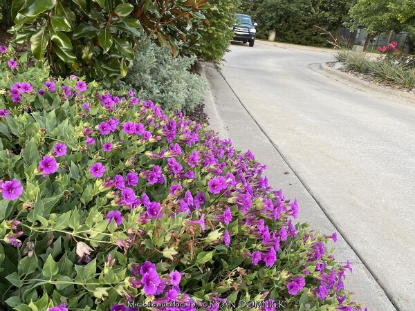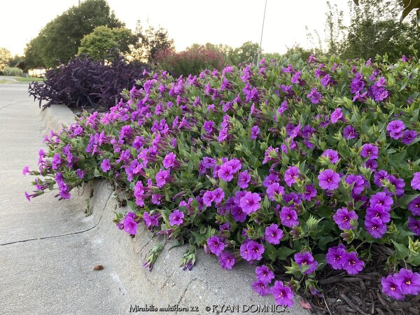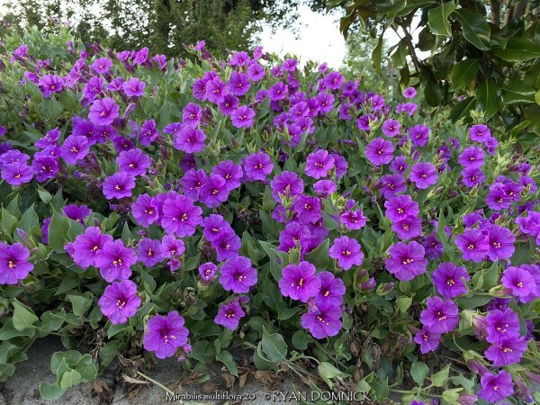 Wild Perennial Four O'Clock (Mirabilis multiflora) is a beautiful mound-forming native wildflower found from Texas, New Mexico, Colorado, and West to California. Flowers, born over a long period, are bright pink with a magenta center. Foliage is an attractive mint green to grey-green with hints of pink on new growth. This tap-rooted herbaceous perennial can grow up to 2 feet tall and 6 feet across but completely dies back in the fall and does not root as it spreads. A mature plant can have hundreds of flowers blooming at the same time! Flowers last only 1 day but more will follow tthe next day. Self-seeding is rare in our Kansas display garden. Typical landscape uses in Kansas are as follows: annual plantings, parking lot islands, hot West and South exposures, south facing berms, and xeriscape gardens. It will thrive in most soils but not poor drainage. Having desert heritage, it resents poor drainage and winter moisture. To counteract that in Kansas, plant in full sun on berm or south-facing wall with poor sandy or rocky soil with no irrigation. It would be very useful as a vine-like perennial cascading over the top of a retaining wall! Amazing that a perennial native to areas receiving 4-10" of rain per year can grow in a climate receiving 4-10 times more rain!