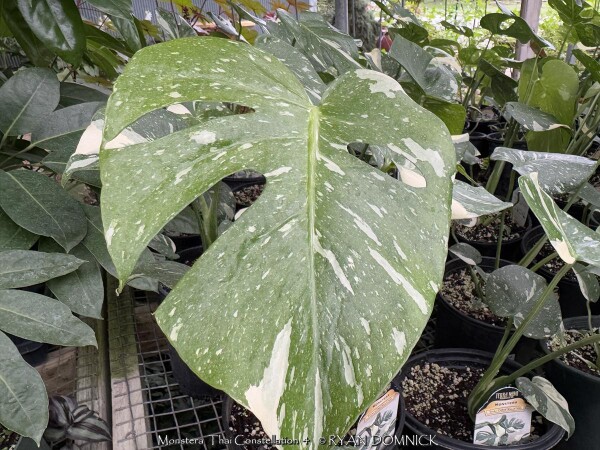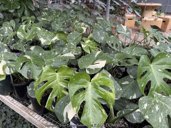 Thai Constellation' Split Leaf Philodendron / Swiss Cheese Plant (Monstera deliciosa) is a large tropical plant. This member of the arum family Araceae is an epiphyte with aerial roots, able to grow up to 66 ft high in the wild, with large, leathery, glossy, pinnate, heart-shaped leaves 12-36" ft long by 12-30" broad. The leaves on young plants are smaller and entire with no lobes or holes, but soon produce lobed and fenestrate leaves as they grow. Although it can grow very tall in nature, it only measures between 6-10 ft) when grown indoors. The older the plant, the more the leaves are covered with its familiar large perforations. This plant lives in the humid tropical forests, in the lowlands and middle mountains, in the extreme south of Mexico, Central America, and south tip of Florida. The seeds fall to the ground, then the seedlings grow towards the dark (negative phototropism) until they meet a tree on which to attach. The many adjacent roots thus allow the plant to anchor against its new support and reach the canopy light (although it rarely grows in full sun and prefers a light dimmed by the foliage). Monstera deliciosa is commonly grown outdoors as an ornamental plant in the tropics and subtropics. The plant requires a lot of space and a rich and loose soil (ideally garden soil and compost in equal parts). If it grows in the ground it is better to plant it near a tree, where it can climb, if not against a trellis. It is moderately greedy and needs to be watered just to keep the soil slightly moist. Hardy to zone 11, it cannot withstand freezing temperatures for more than a few hours. A steady minimum temperature of at least 55-59°F is preferable, allowing continuous growth. Growth ceases below 50°F but tolerant down to 32°F if kept on the dry side. Its architectural qualities, ease of cultivation, and tolerance of a wide range of conditions make it an ideal plant for indoor cultivation as well. For this reason it is a popular plant for the home or office throughout the temperate northern hemisphere. It prefers bright indirect light and temperatures of 68-86°F. Flowering is rare when grown indoors. Along with other tropicals and succulents in Kansas, 'Thai Constellation' Split Leaf Philodendron / Swiss Cheese Plant is usually grown as large summer patio plant. Water regularly and place in full shade or very limited morning sun possibly in a large ceramic pot under an established shade thee for the summer. They handle the transition moving in and out rather well and hold up nicely during winter if you have dark, cold, or un-ideal conditions provided that they get a good growing season outdoors for 1/2 the year.