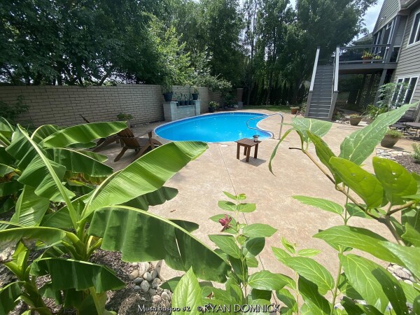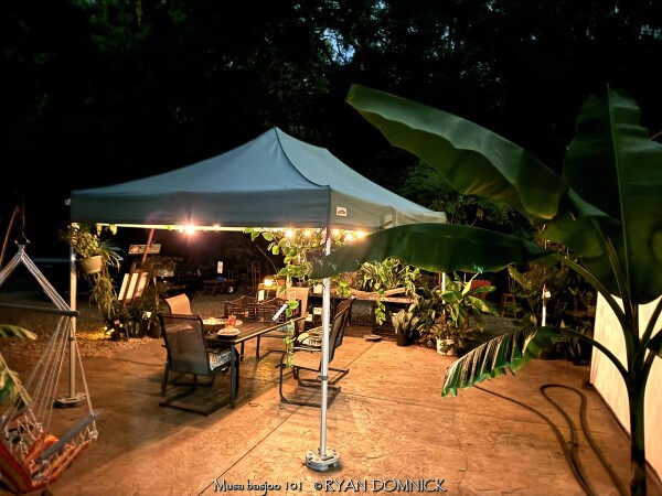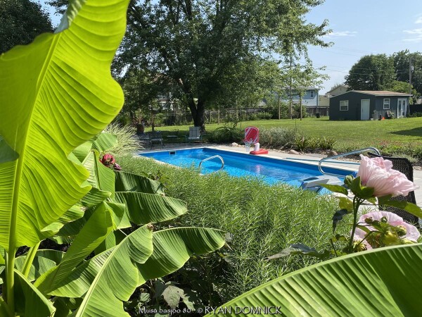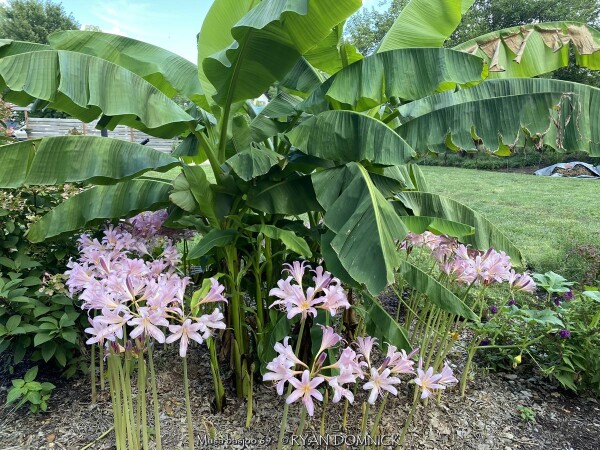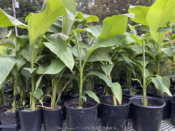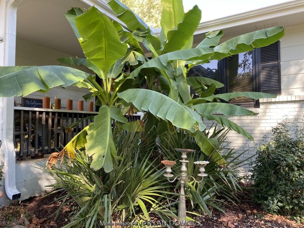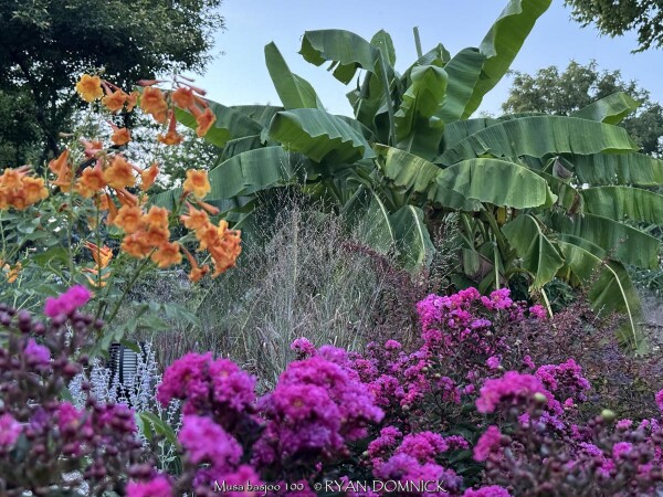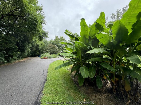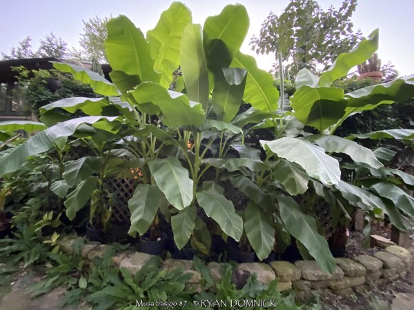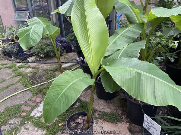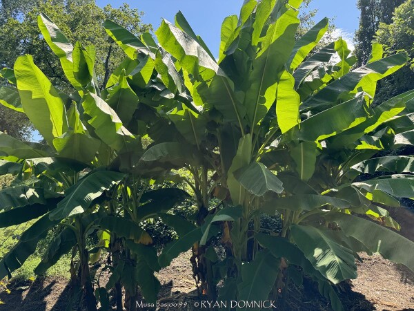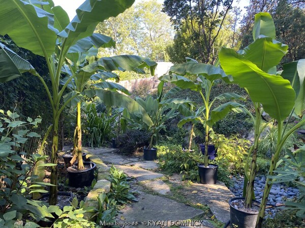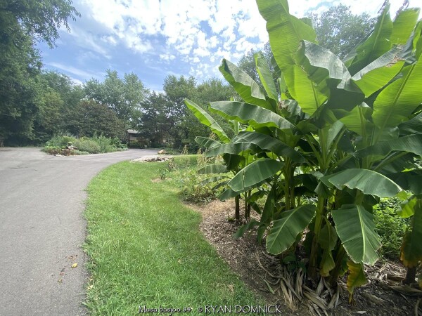 Create a tropical effect in your landscape with these large fast-growing cold hardy Musa basjoo! (also called Japanese fiber banana) Each leaf can be 6 feet long and 2 feet wide. Leave in ground and mulch 6" thick and they will return as perennials every year. If planting on the south side of a house in full sun, little protection is needed. These have proven hardy in Lawrence, KS (zone 6a) for over 20 years. In Eastern Kansas, typically our 40 inches of rainfall is sufficient without extra water in good soils. This species will tolerate some degree of drought but fastest growth will occur in rich well-drained soils with extra water and fertilizer provided during the summer. Great for summer wet areas in full sun or around swimming pools (creates no messes). Plants are capable of growing 15-18 feet by the end of summer when established and happy! A more realistic height is 7-12 feet under average conditions. Banana trees will slowly divide and send up offsets; this is a desirable sign that the banana tree is establishing well. If 1-2 feet of trunk is protected with a large pile of leaf mulch, you will get a flower followed by small inedible bananas the 2nd year on the largest trunk. The flowering trunk will die but the offsets will grow. Bananas will not tolerate excessively wet soils during dormancy. Sunburning can happen with summer temperatures over 100 degrees F but it will quickly outgrow the damage. Bananas need at least 1/2 day of full sun and protection from excessive winds to properly grow. Listed by many sources as hardy to zone 6 or 7, with proper mulching and placement near a foundation, you can easily grow this into zone 5 or possibly lower. In our trial gardens in Lawrence, KS (zone 6a), two well established specimens have thrived for 15 years and counting. During the arctic blast of February, 2021, lows down to -17 degrees F on Feb 16th, 2021 were recorded. The longevity of this cold blast was also impressive: 10 days on a row with highs of 10-15 degrees F or lower, 8 nights of lows in the single digits and negatives, and 36 straight hours of 0 degrees F and mostly lower. A hard ground freeze was inevitable; hundreds of plants around town survived this event returning a little late the following spring but otherwise just fine. Some were mulched with ground up leaf mulch, some were not.