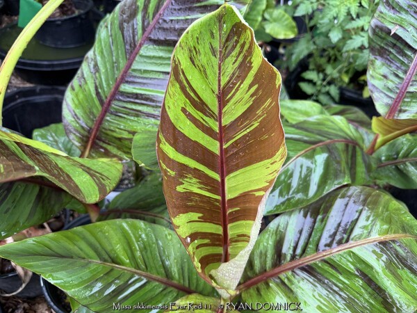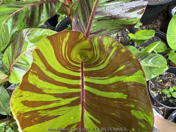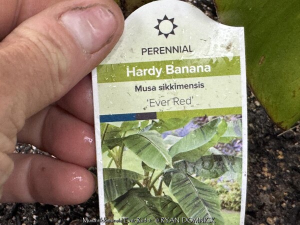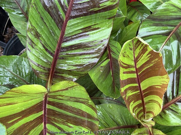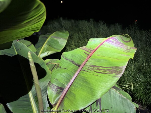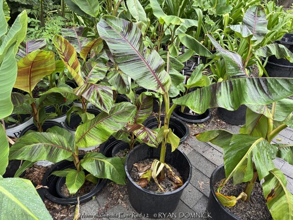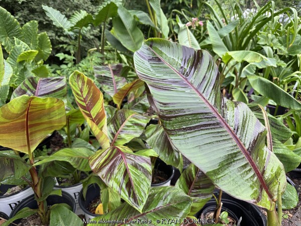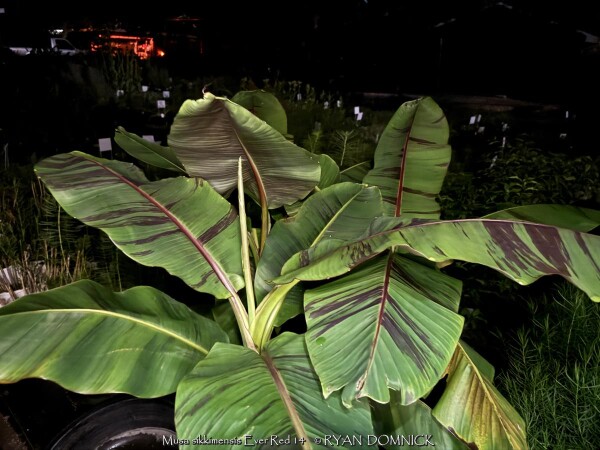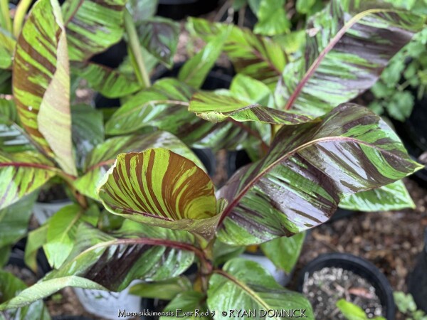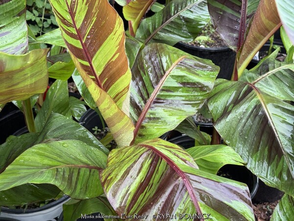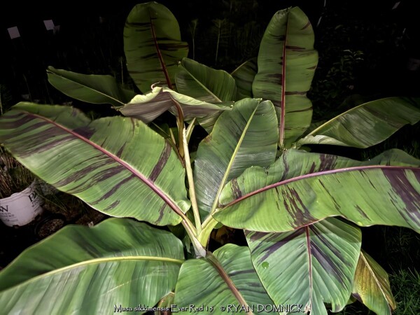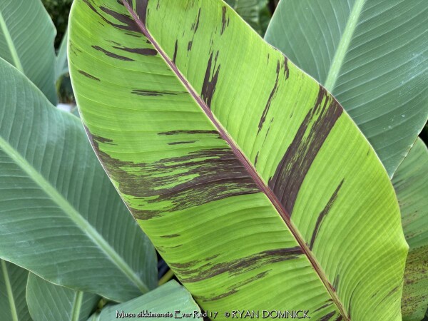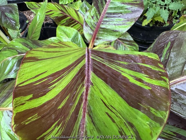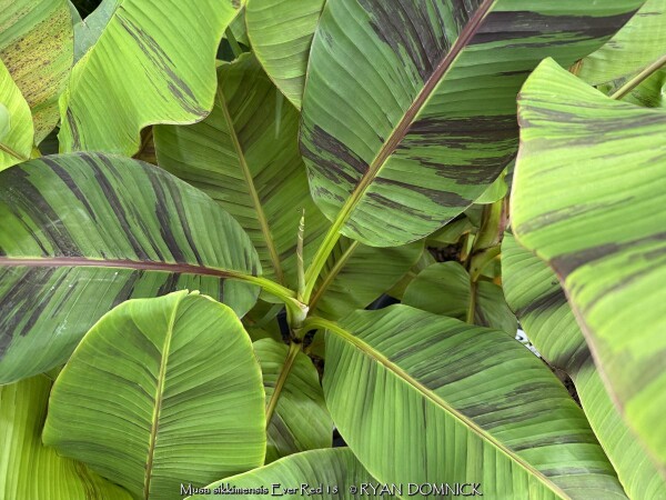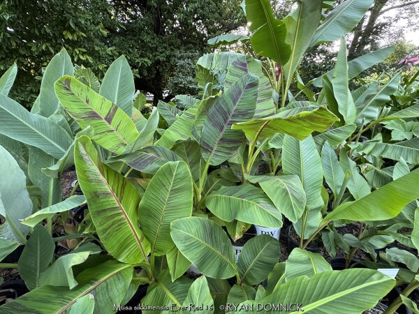 Create a tropical effect in your landscape with the worlds most cold red-leafed banana. Fast-growing and cold hardy, Red Hardy Banana Tree (Musa sikkimensis 'Ever Red') features reddish maroon striped randomly along the leaves in various widths to create a spectacular show! Leave in ground and mulch 6-9" thick and they will return as perennials every year. In Eastern Kansas, typically our 40 inches of rainfall is sufficient without extra water in good soils. This species will tolerate some degree of drought but fastest growth will occur in rich well-drained soils with extra water and fertilizer provided during the summer. Great for wet areas in full sun or around swimming pools (creates no messes). Plants are typically grow 5-8 feet by the end of summer and upto 15 feet in year two. Banana trees will slowly divide and send up offsets; this is a desirable sign that the banana tree is establishing well. The flowering trunk will die but many new offsets will take its place. Bananas will not tolerate excessively wet soils during dormancy. Sunburning can happen with summer temperatures over 100 degrees F but it will quickly outgrow the damage. Bananas need at least 1/2 day of full sun and protection from excessive winds to properly grow.