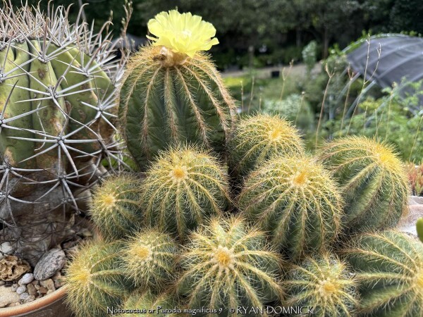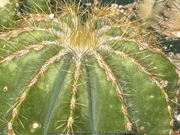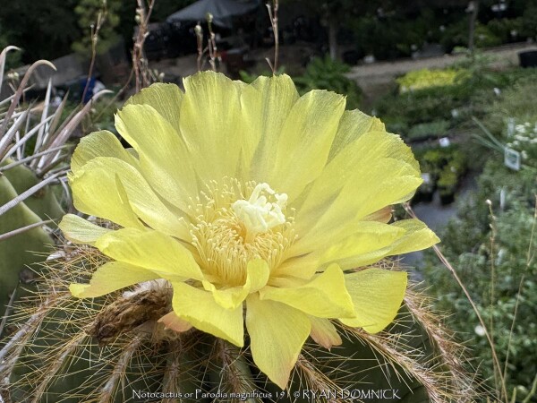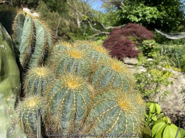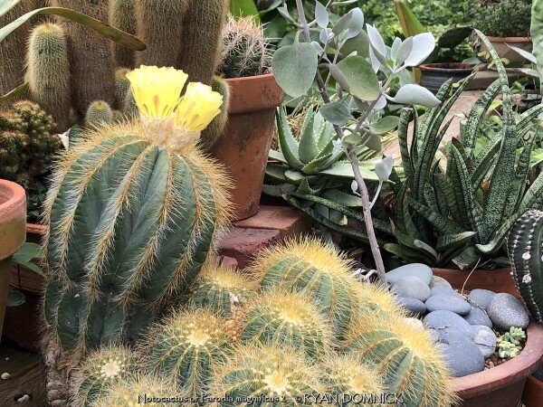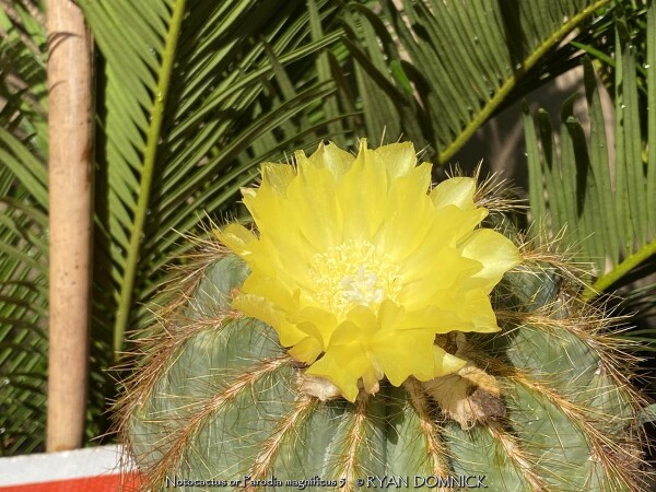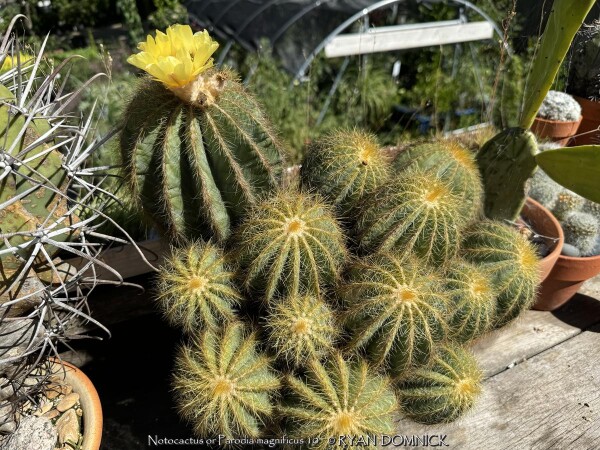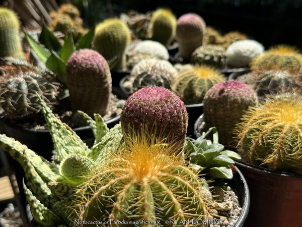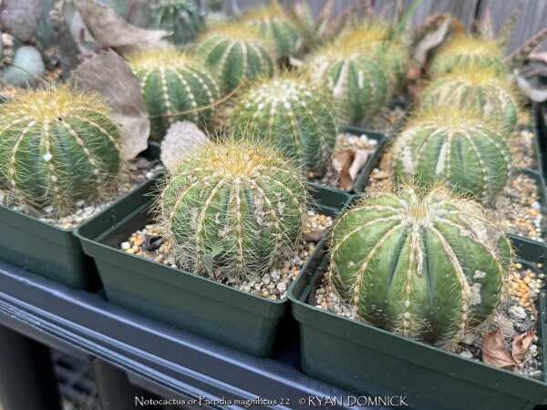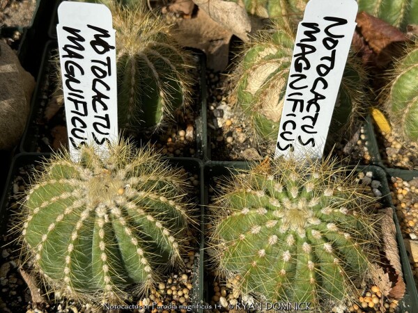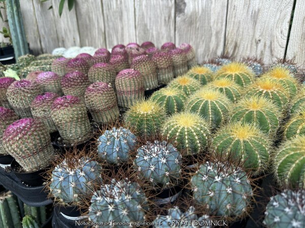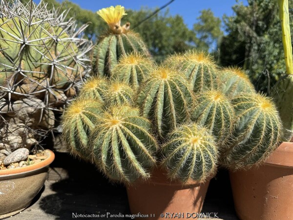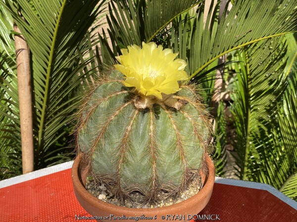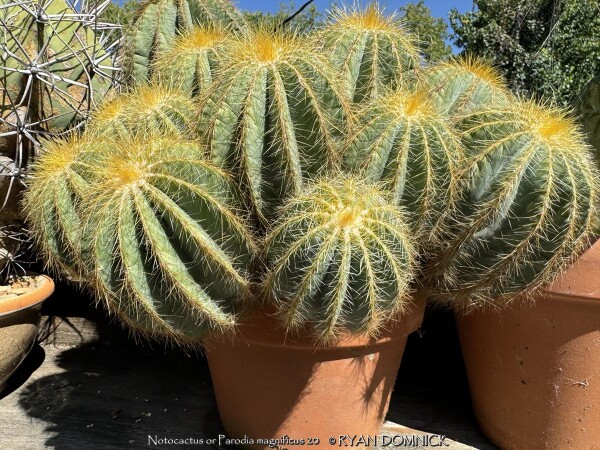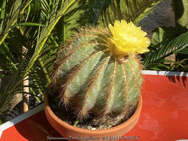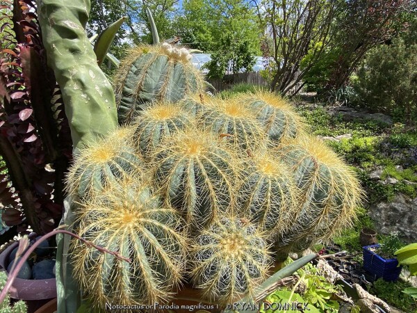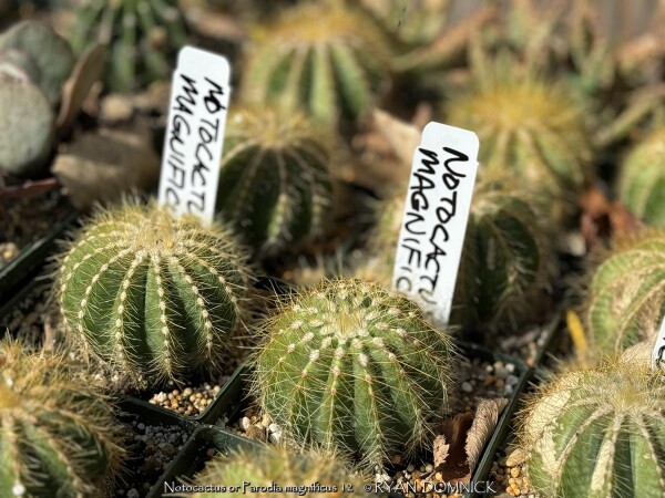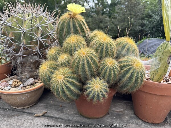 ***Description for this plant available with future update!*** Notocactus / Parodia magnificus is also known as Balloon Cactus (Tropical)>>>>> Cacti are known for their spines, unusual shapes and beautiful flowers. Both succulents and cacti store water in their fleshy tissues. And can survive long periods without water. Cacti and succulents are usually grown as a deck/patio plant or house plant in Kansas. Grow in full sun with little to no extra watering except that which comes from rainfall. Generally, plants may be brought out in Late May through Early October in our zone 6a Lawrence, KS climate. To play is safe, potted plants are best moved in before autumn leaves begin to drop and before night temperatures get below 45 degrees F. It is very important to avoid the combination of wet and cold. Move to a bright interior window over the winter with little to no watering and keep above 50 degrees F. As a winter house plant, it will look presentable all winter long with little to no waterings. As a permanent house plant, provide bright light and allow the soil to dry completely between waterings and you will get many years of carefree enjoyment. Plants grown permanently indoors may eventually begin to elongate stretching for light and lose their spine color. It can be hard to reproduce the intense UV sunlight they need when growing indoors so moving outside for the summer is best. Generally if moving outside for the summer, allow 1-2 weeks of part shade or morning sun before placing in full sun. Plants with time to acclimate will thrive in full sun but be careful not to rush it or sunburning may occur. Repotting may or may not be needed depending on how large you want the plant to grow; plants can continue to grow taller and tolerate extremely root-bound pots but may need wind bracing. If repotting, make sure to use a sharp draining low organic cactus mix with plenty of sand and perlite but avoid peat moss. The “soil” most commercial cacti are potted in to too peaty and light weight. This soil becomes hydrophobic and shrinks after becoming bone dry and difficult to re wet again. Cacti never grow in peat-based soils in nature; this “Soil” is only good for shipping because of the light weight. Potted plants are very low maintenance but watch for scale and mealybugs that may hide beneath the cover of spines. The best pest removal approach is to periodically wash the cactus off. Achieve this with a water nozzle or hose breaker turned mostly off to increase the pressure from the blast of water. This high-pressured water kills the pests without damaging the thick cactus skin. Here are some little-known or rare factoids about cacti: 1. The "spines" are actually modified leaves filled with sap at first, then quickly drying out to form the spines! 2. Many cacti have bright colored flowers that mainly attract bees, while some tubular flowering types attract hummingbirds and bats. 3. Late on the evolutionary timeline, cacti fossils are rare to non-existent. Cacti are native almost exclusively to the Americas, while succulents can include a much larger plant palette be from any dry area in the world. 4. Some cactus plants have been known to survive more than 2 years without water. 5. Some cacti first evolved in a dry climate that later became wetter again. For example: several jungle species live as epiphytes in trees to achieve the fast drainage they need.