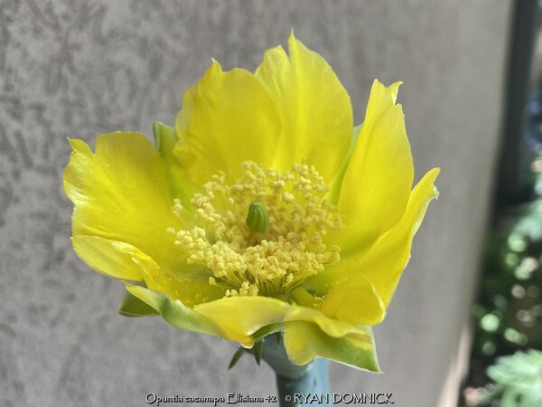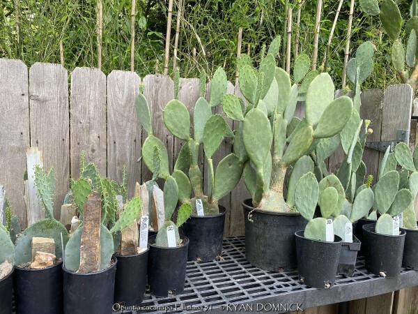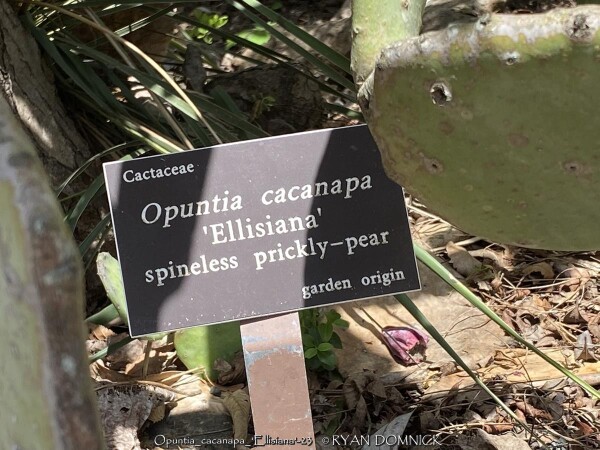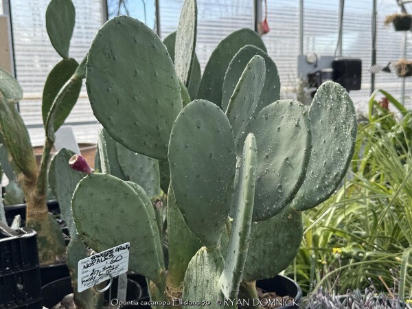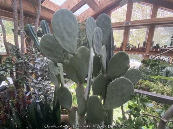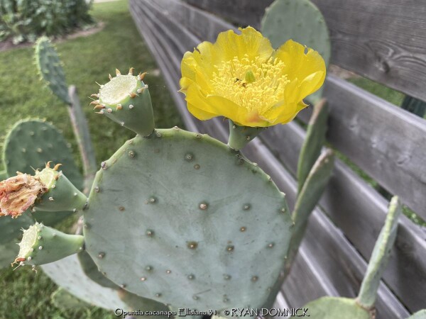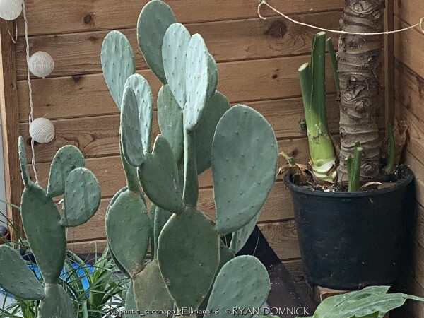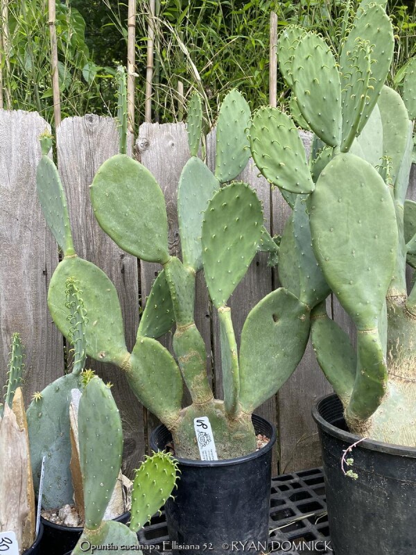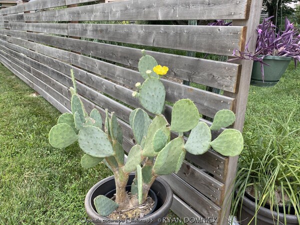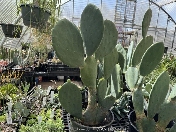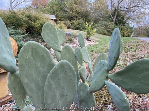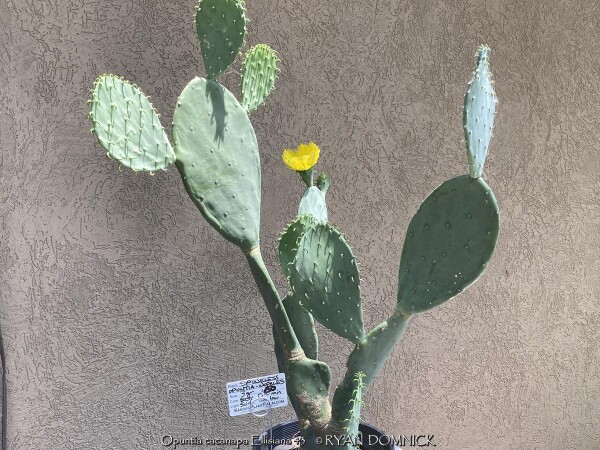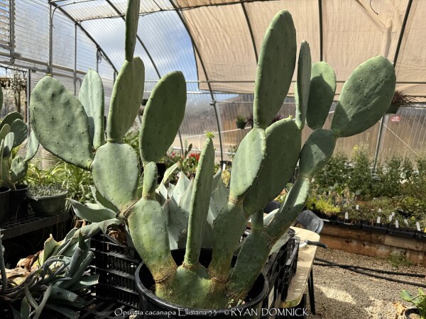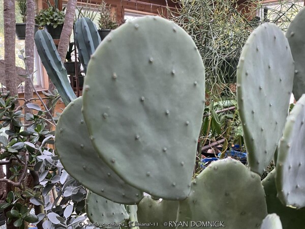 This prickly pear (Opuntia cacanapa 'Ellisiana') is truly spineless! Yes, completely spineless and free of glochids. The smooth green paddles and upright growth habit create a unique addition to the desert garden. The pads are sparsely spined, light green, and hardy to about 0 degrees F. This cactus has a place as one of the few upright cacti that can handle extreme cold. Ellisiana Spineless Prickly Pear is most often used as a patio plant in Kansas. Place in full sun with no extra watering except from rainfall. Repotting may or may not be needed depending on how large you want the plant to grow. Potted plants are hardy to at least 10 degrees F if kept dry so you can wait awhile to move these in for the winter. Then move into a cold garage, basement, or window over the winter with NO watering. Although un-tested by the author, this opuntia could survive in a microclimate under a south facing roof overhang kept completely dry in the winter and controlled water in the summer in zone 6a. Several plantings in Tulsa, Oklahoma at the Gathering Place endured temperatures as low as -11 degrees F along with prolonged cold (5 days of highs in the teens and lows in the single digits) in February, 2021. This interesting and "completely safe" cactus, when special ordered in quantity, can be used as an annual mass planting in the landscape. If grown as a patio or house plant, move to a bright interior window over the winter before extreme cold occurs with no watering and keep above freezing. If grown as a summer patio plant, move to a bright interior window over the winter before extreme cold occurs with no watering and keep above freezing. As a winter-only house plant, it will look presentable all winter long with just no waterings. As a permanent house plant, provide bright light and allow the soil to dry between waterings for many years of carefree enjoyment. Pads are easy to propagate.