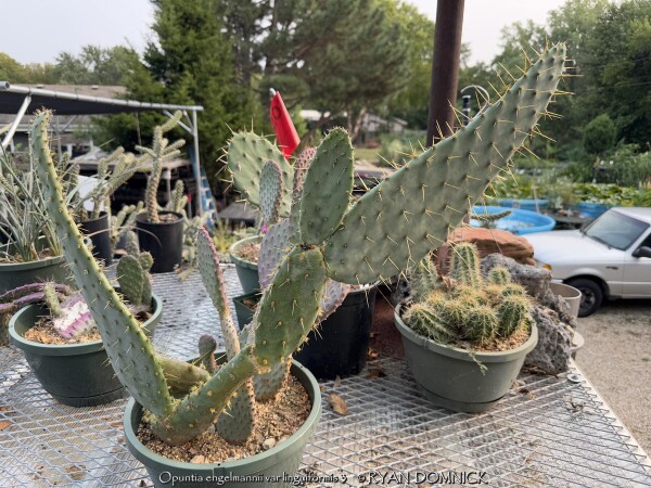 ***Description for this plant available with future update!***The yellow flowers, maroon long lasting fruits, and upright growth habit of this cactus (Opuntia engelmannii var. linguiformis) create a unique addition to the desert garden. The pads are sparsely spined, light green, and hardy to about -5 degrees F. Native to arid soils in Texas and Oklahoma, this cactus has a place as one of the few upright cacti that can handle extreme cold. In fact, I have seen this species growing a in Lawrence, KS in desert gardens along a south wall of a house. With well drained soils and proper micro-climate, this cactus can handle our extreme cold and excess rainfall of Eastern Kansas with excellent drainage.