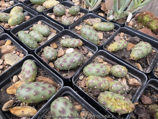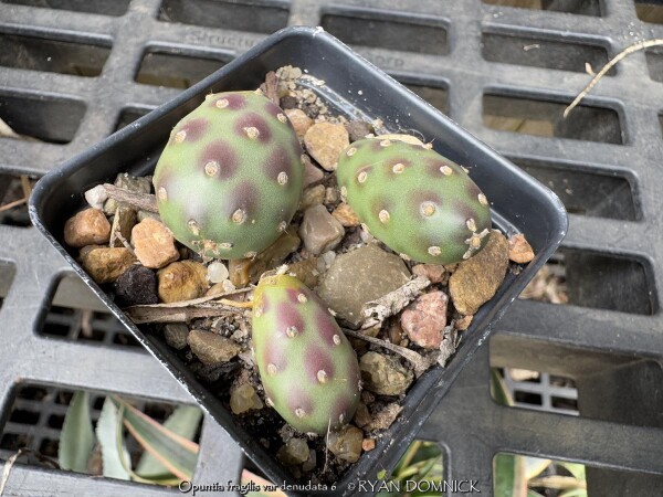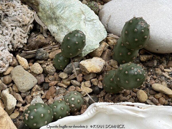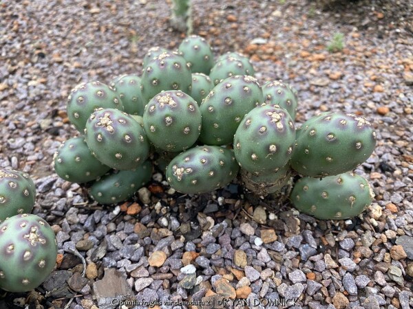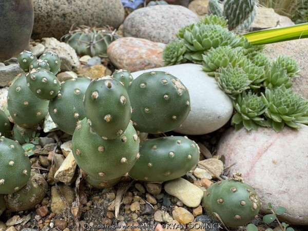 These tiny perennial succulent cacti (Opuntia fragilis 'Potato') produce globe-shaped, spherical stems make this selection unique. 'Potato' prickly pear is virtually spineless. It is native to mountainous areas in Western Colorado. The olive green "pads" take on a lovely winter blush of purple in cold weather. Grow this small native gem in a Kansas rock garden, in cracks between rocks, or on top of or in a retaining wall. You may also grow in flat areas like in between stepping stones provided you used a gravelly or sandy base for the stones. It will not tolerate rich moist soils as other plants or weeds will shade it out. Root rot can occur during lengthy hot humid summer rainy periods. If grown as a summer patio plant, move to a bright interior window over the winter before extreme cold occurs with no watering and keep above freezing. As a winter-only house plant, it will look presentable all winter long with just no waterings. Upon moving outside the following spring, plants with plenty of time to acclimate will thrive in full sun but be careful not to rush it or sunburning will occur. Generally if moving outside for the summer, allow 2-3 weeks of part shade or morning sun before placing in full sun. If grown in pots permanently outdoors, keep on the dry side in minerally sandy soil. You may leave out all winter allowing to freeze solid (Hardy to zone 4a); plants will go dormant and resume growth in the spring. As a permanent house plant, provide bright light and allow the soil to dry between waterings for many years of carefree enjoyment. Little potato-like pads are easy to propagate. Our original plant came from Plant Delights Nursery in North Carolina and also available on their mail-order website.