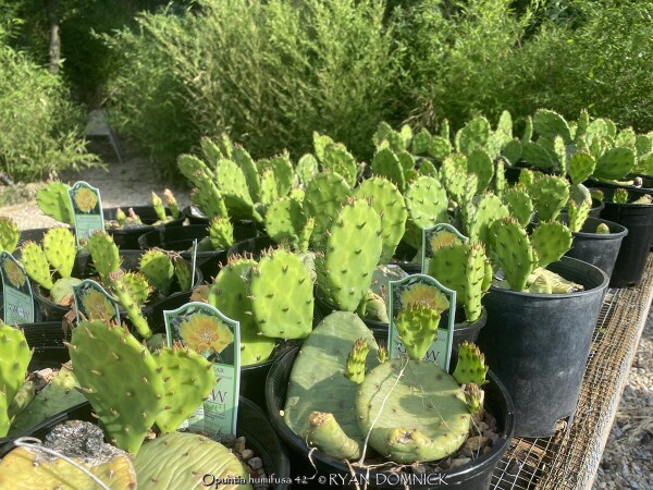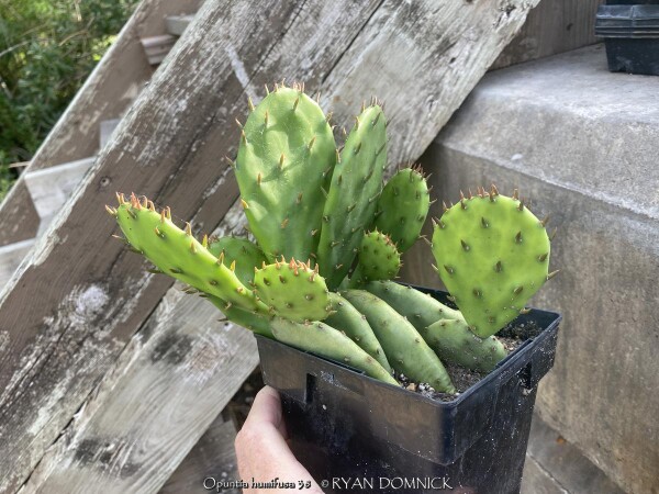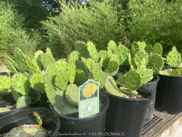 Eastern Prickly Pear Cacti (Opuntia humifusa) have attractive green pads, brilliant yellow flowers in June, and pinkish maroon edible fruits afterward that last into winter. They are native to eastern woods of Kansas, Missouri, Oklahoma, Texas, Arkansas and much of the Southeast United States. This cold hardy succulent occupies an unusual niche: growing in poor shallow sandstone based soils in open woods and on sunny rock cliffs that dry out too quickly for most other plants to colonize. Pads are sometimes carried off by animals and take root elsewhere. Grow this small native gem in rock gardens, dry shade areas, in parking lot medians, in cracks between rocks, or on top of or in a retaining wall. This species will grow in full sun or full shade! Although not picky about soils, just ensure that drainage is good. If grown in exterior pots and kept on the dry side, you may leave out all winter allowing to freeze solid; plants will go completely dormant and resume growth in the spring. Although these prickly pear do not have spines, they do have glochids. (painful bristles that come off and irritate the skin for a few days) Great low maintenance cold hardy and very versatile succulent.