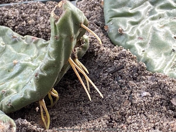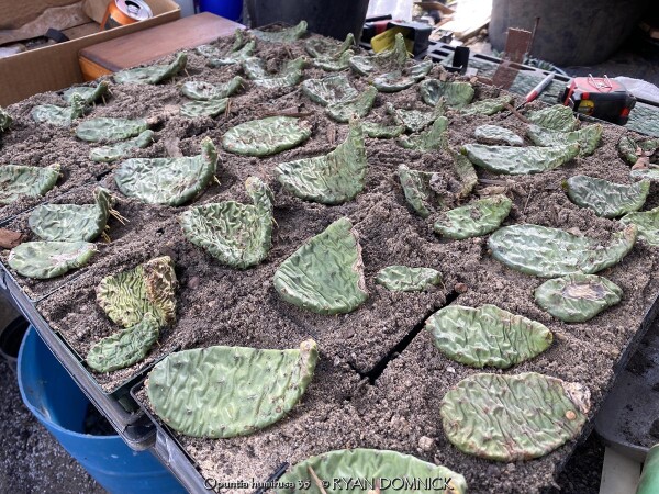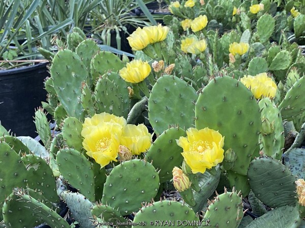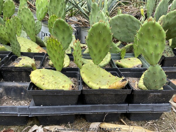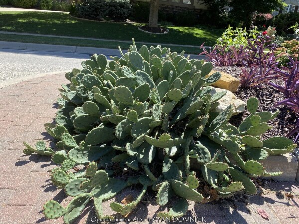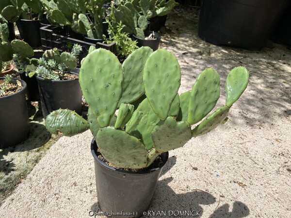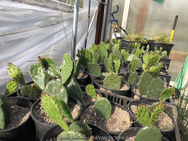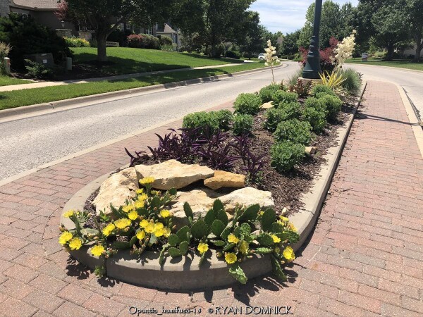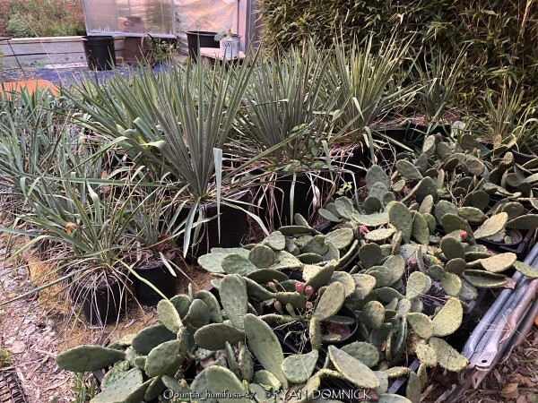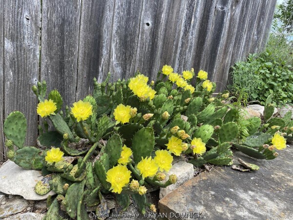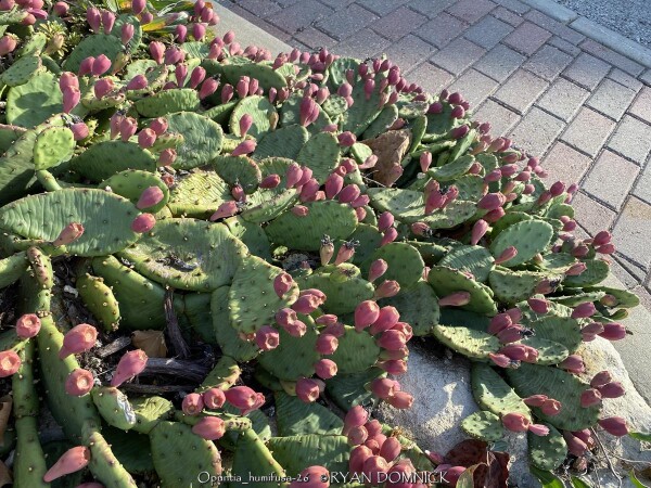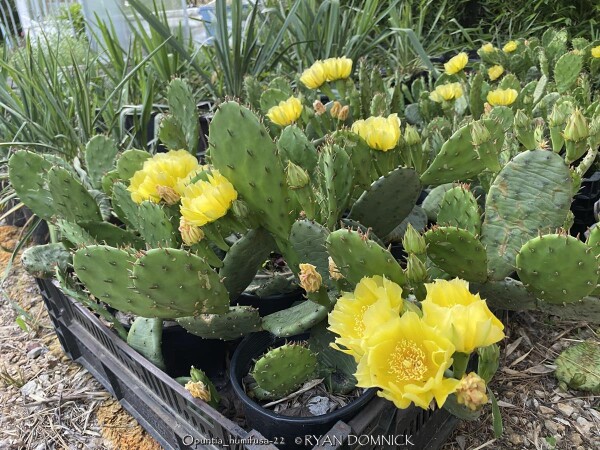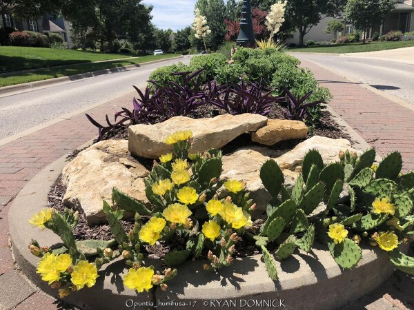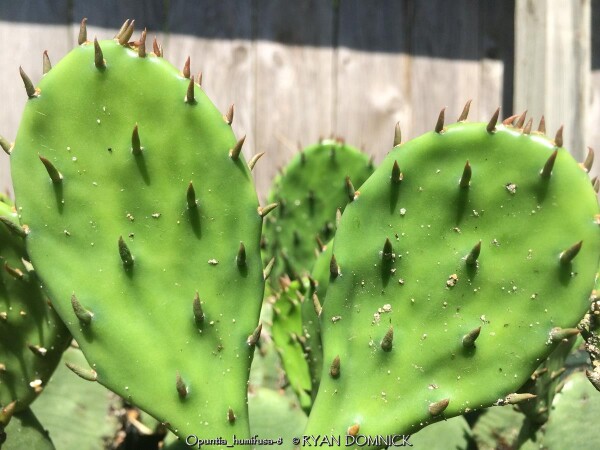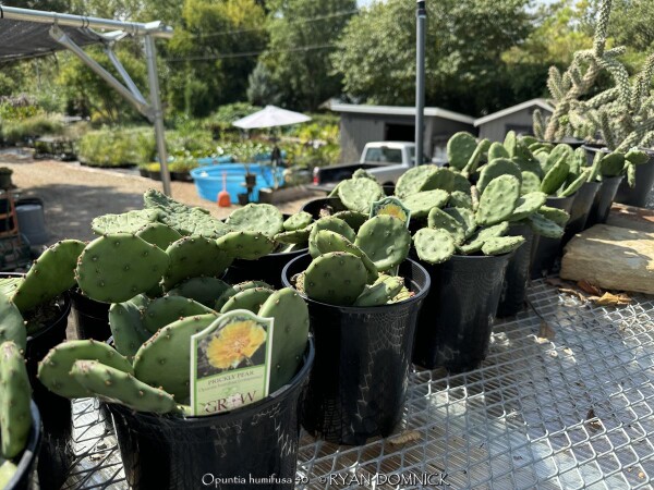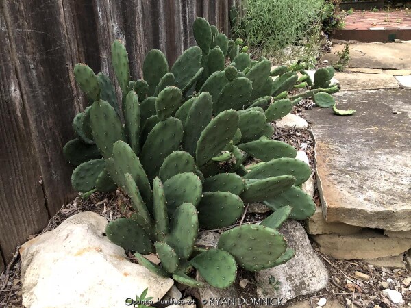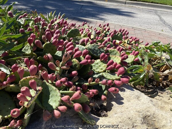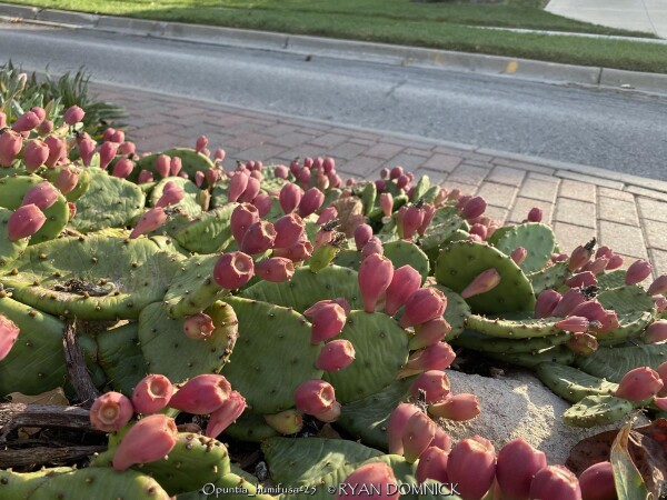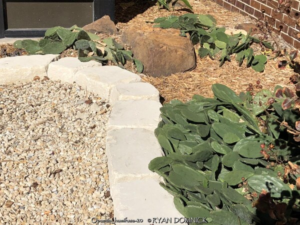 Eastern Prickly Pear Cacti (Opuntia humifusa) have attractive green pads, brilliant yellow flowers in June, and pinkish maroon edible fruits afterward that last into winter. They are native to eastern woods of Kansas, Missouri, Oklahoma, Texas, Arkansas and much of the Southeast United States. This cold hardy succulent occupies an unusual niche: growing in poor shallow sandstone based soils in open woods and on sunny rock cliffs that dry out too quickly for most other plants to colonize. Pads are sometimes carried off by animals and take root elsewhere. Grow this small native gem in rock gardens, dry shade areas, in parking lot medians, in cracks between rocks, or on top of or in a retaining wall. This species will grow in full sun or full shade! Although not picky about soils, just ensure that drainage is good. If grown in exterior pots and kept on the dry side, you may leave out all winter allowing to freeze solid; plants will go completely dormant and resume growth in the spring. Although these prickly pear do not have spines, they do have glochids. (painful bristles that come off and irritate the skin for a few days) Great low maintenance cold hardy and very versatile succulent.