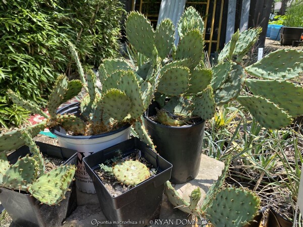 Plains Prickly Pear Cacti (Opuntia macrorhiza) have attractive green pads, brilliant yellow flowers in June, and pinkish maroon edible fruits afterward that last into winter. They are native to much of the Great Plains from Texas to Minnesota. Pads are sometimes carried off by animals and take root elsewhere. Grow this small native gem in rock gardens, dry shade areas, in parking lot medians, in cracks between rocks, or on top of or in a retaining wall. Although not picky about soils, just ensure that drainage is good. If grown in exterior pots and kept on the dry side, you may leave out all winter allowing to freeze solid; plants will go completely dormant and resume growth in the spring. Although these prickly pear have spines and glochids. (painful bristles that come off and irritate the skin for a few days) so be careful around children and pets. Great low maintenance cold hardy and very versatile plant!