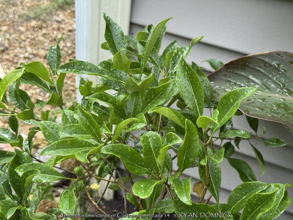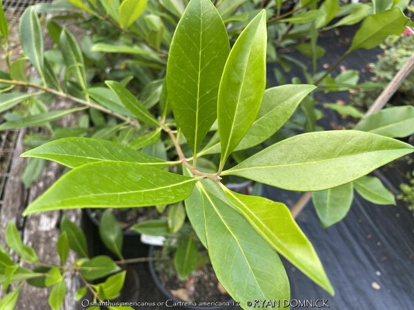 Devilwood (Osmanthus americanus / Cartrema americana) has very hard and dense wood, hence the name. It is a slow-growing evergreen shrub or small tree native to southeastern North America and Mexico. Bright green simple leaves emerge in spring turning deeper green in summer. Cream white flowers borne on separate trees and female trees produce abundant blue/black fruit. Growth habit is somewhat open so don't count on it to provide screening or density. Grows in sun or shade but in the northern part of its range, growth is too slow and sparse in the shade. Devilwood grows in most soils including moist ones and occasional flooding. This making it an ideal rain garden plant. Becoming more drought tolerant when established, our 40 inches of typical rainfall in Eastern Kansas is sufficient if planted in good soils. The cold hardiness is surprising: as a zone 5, this could be one of the most cold-tolerant broadleaf evergreens trees available! It survived -16 degrees F and a week of single digit highs in February, 2021 with no damage. It even maintains bright green foliage in winter opposed to a dingy brownish-green like some evergreens. Useful in the garden as a background evergreen shrub or small tree. Sold as Osmanthus americanus, Cartrema americana is technically it's new botanical name.