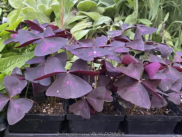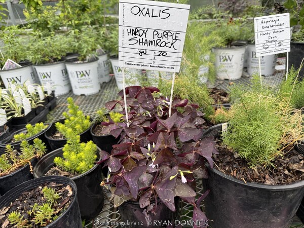Oxalis triangularis is also commonly called Purple False Shamrock. It is a species of perennial plant native to several countries in southern South America. Grown mostly for its bright purple shamrock-like leaves and occasional pink flowers, the leaves also move in response to light levels, opening in high ambient light (in the day) and closing at low light levels (at night) In Kansas gardens it is normally grown in containers as an annual, patio plant or house plant. If grown in well drained soil planted in the ground in the right micro-climate (South-facing exposure), it may be a perennial. If low temperatures hit -10 degrees F, it may kill an un-mulched plant; protect any zone 6 perennial with thick layer of mulch. In our trial gardens in Lawrence, KS (zone 6a), three established specimens planted 3-4" deep and mulched 4-6" with leaf mulch survived -17 degrees F. During the arctic blast of February, 2021, lows down to -17 degrees F on Feb 16th, 2021 were recorded. The longevity of this cold blast was also impressive: 10 days on a row with highs of 10-15 degrees F or lower, 8 nights of lows in the single digits and negatives, and 36 straight hours of 0 degrees F and mostly lower. More testing would be good to evaluate true cold-tolerance.