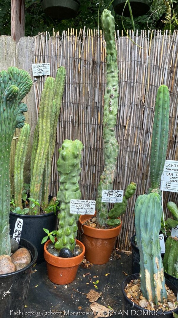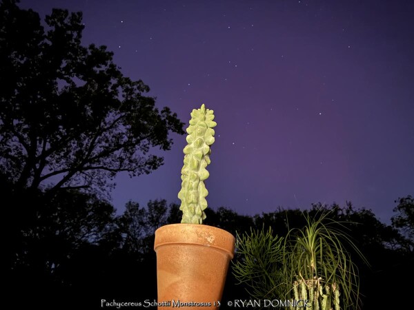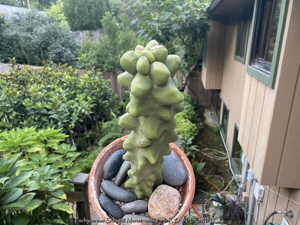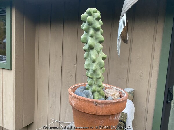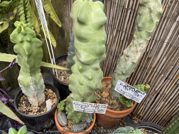 Pachycereus Schottii (Pachycereus schottii f. monstrosus) is native to the desert regions of mainland Mexico and the Baja California peninsula of Mexico. The monstrous form is restricted to a small area about halfway down the Baja peninsula. In the wild, established plants are hardy to about 25 degrees F for short periods of time. Totem pole cacti are usually grown as a patio or house plant in Kansas. Grow in full sun with occasional extra watering including that which comes from rainfall. Repotting may or may not be needed depending on how large you want the plant to grow; plants can continue to grow taller and tolerate extremely root-bound pots but may need wind bracing. If repotting, make sure to use a sharp draining medium organic cactus mix with plenty of sand and perlite. To play is safe, potted plants are best moved in before night temperatures get below 45 degrees F. It is important to avoid the combination of wet and cold. Before extreme cold occurs, move to a bright interior window over the winter with no watering and keep above freezing. As a winter house plant, it will look presentable all winter long with no waterings.(also to prevent lanky winter growth) As a permanent house plant, provide bright light and allow the soil to dry between waterings for many years of carefree enjoyment. Plants grown permanently indoors may begin to elongate stretching for light and lose their spine color. It can be hard to reproduce the intense UV sunlight they need so moving outside for the summer is best. Generally if moving outside for the summer, allow 1-2 weeks of part shade or morning sun before placing in full sun. Plants with time to acclimate will thrive in full hot sun but be careful not to rush it or sunburning can occur. Potted plants are very low maintenance. I have never seen any insect problems on this plant. Pachycereus schottii f. monstrosus is the most attractive monstrous form with pronounced knobby tubercles and smooth green skin; it is rare and will command a higher price than most other houseplants. Another naturally occuring monstrous form, Pachycereus schottii f. mieckleyanus, also has smooth green skin but thinner stems with less tubercles.