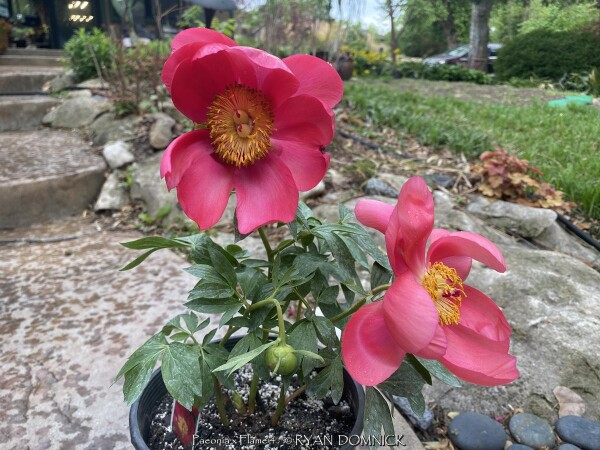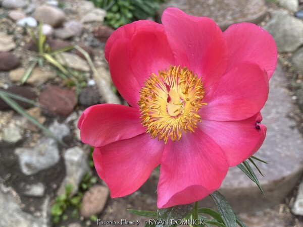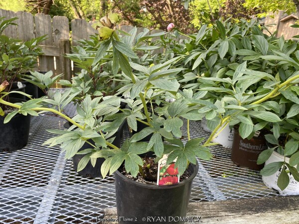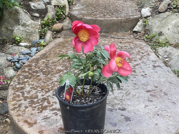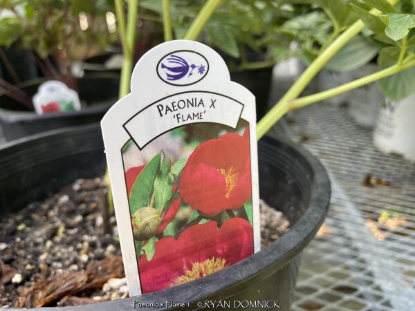 Peonies (Paeonia), along with roses are one of the most universally well-known flowers. The toughness and durability of this plant can be seen in cemeteries or around abandoned houses, surviving decades even 100 years or more without care. Peonies are native to China in cold continental climate areas but also do well in Kansas. Large flowers come in different shades of white, red, and pink. Peonies bloom usually around Memorial Day hence their popularity and cemeteries. Blooming lasts about 2 weeks but can be short-lived if a thunderstorm happens during the last week of blooming when petals are fully open. In zone 6 and south, the foliage is glossy green and attractive throughout the first half of summer. Usually, by late summer, foliage is tattered from drought stress and diseases. This has no ill effect on the health of the plant as it is already set its growth buds for next year. In northern areas (USDA zones 3-5), Peony foliage lasts all summer and turns a brilliant red and orange color in the fall. Due to its need for cold winters, peonies will not grow well further south than zone 8b. Gardeners in south Florida have had success getting peonies to bloom by dumping a bag of ice on the dormant plant every day for 5-6 weeks in winter: sounds like a lot of work huh! Due to its cold tolerance, peonies may be grown in above-ground pots or raised planters year-round. When planting outside, be careful to plant at the correct depth with pink buds slightly below the soil or plants will not bloom. Overall, peonies are a very reliable long-lived plant in Kansas surviving everything. But they do require some maintenance to look their best. Ultra cold-hardy plants from northern climates normally dislike our long hot humid summers; although we are on the Southern edge of this plant's adaptability, it still survives reasonably well here. Look for a cold microclimate planting location such as East or North exposure. Peony 'Flame' features single flowering red blooms displayed on the bold erect stems.