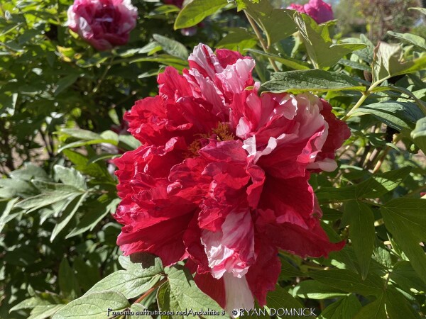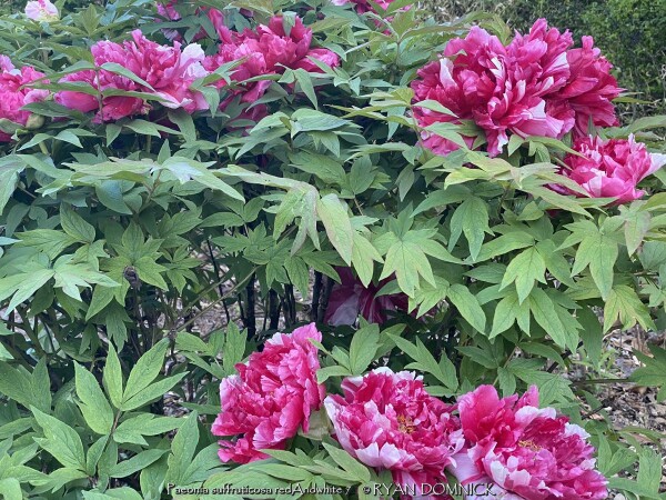 Tree Peonies (Paeonia suffruiticosa) are larger, woody relatives of the common herbaceous (perennial) peony. It does not die to the ground each winter, instead growing up to 3-5 feet after many years. Tree peonies have been in culture in China for millennia. Most "tree" peonies are really just shrubs and are grafted to the rootstock of herbaceous peonies. Peonies, along with roses are one of the most universally well-known flowers. The toughness and durability of this plant can be seen in cemeteries or around abandoned houses, surviving decades even 100 years or more without care. Both tree and herbaceous peonies are native to China in cold continental climate areas but also do well in Kansas. Large flowers come in different shades of white, red, and pink. Blooming only lasts about 3-7 days and can be short-lived if a thunderstorm happens during the second day of blooming when petals are fully open. The foliage is especially attractive in spring when unfurling into a flat, rich green and remains attractive throughout summer. Usually, by early fall, foliage is tattered from drought stress and diseases with no appreciable fall color. This has no ill effect on the health of the plant as it is already set its growth buds for next year. In northern areas (USDA zones 3-6), Peony foliage lasts all summer and turns brilliant red and orange colors in the fall. Due to its need for cold winters, peonies will not grow well further south than zone 8b. Due to its cold tolerance, peonies may be grown in above-ground pots or raised planters year-round. Ultra cold-hardy plants from northern climates normally dislike our long hot humid summers; although we are on the Southern edge of this plant's adaptability, it still survives reasonably well here. Several have been alive for over 15 years and bloom like clockwork each spring here in our Lawrence, KS display garden.