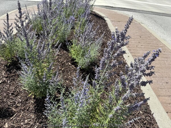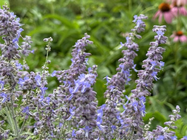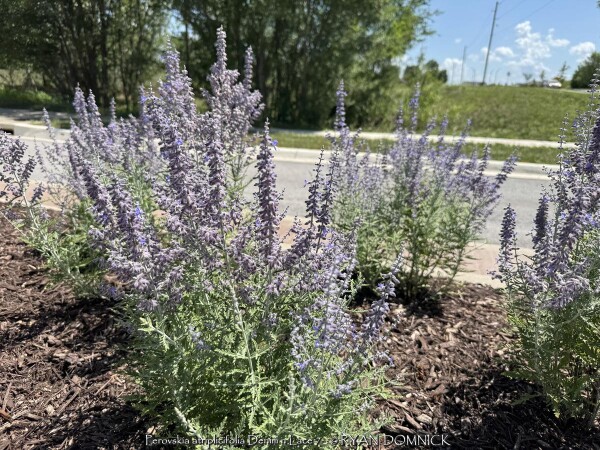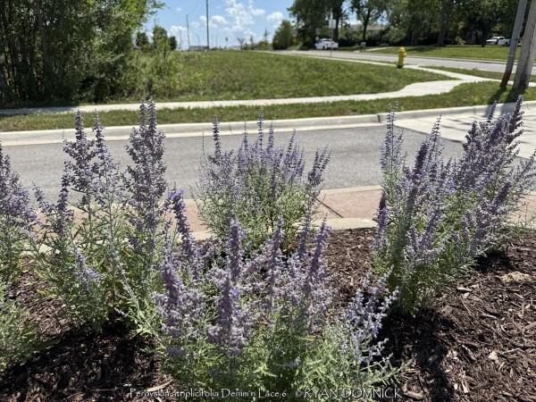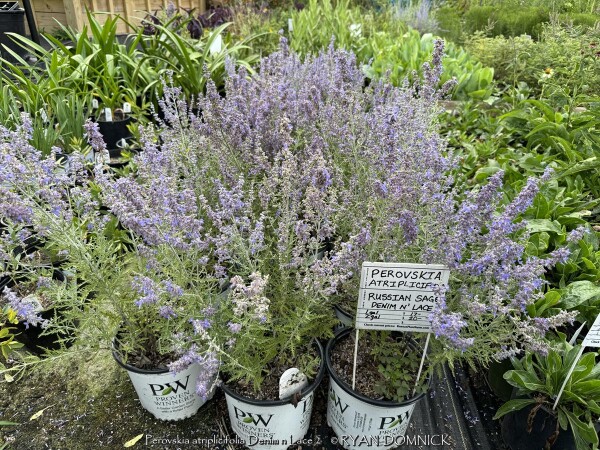 Russian sage (Perovskia atriplicifolia) is a perfectly well-adapted plant from Afghanistan, Pakistan, and Central Asia. It is the perfect match to hot Kansas summers, cold winters, rocky alkaline soils, and drought. Fine-textured foliage is upright and shrub-like consisting of a mint green to blush green color. Lavender to bluish flowers emerging in mid-summer are extremely long-lasting. In fall, Russian sage foliage dies back with the first hard freeze and becomes a whitish-gray color adding awesome winter interest. Imagine this combined with ornamental grasses or bright winter-colored plants like Color Guard Yucca. The only maintenance is cutting the plant back to you about 6 to 8 inches in the spring. New buds emerge from the root system and lower parts of the woody growth. New cultivars of Russian sage do not spread by rhizomes like the species. Russian sage thrives in dry well-drained soils with plenty of full sun and air circulation. They are suitable for hot west or south exposures, berms, parking lot islands, hell strips along roads, and other inhospitable locations. They tolerate poor soil including rock, sand, clay, and alkalinity. They do not tolerate poor drainage and will be floppy even in part shade. Russian sage flowers are highly attractive to honeybees. There are several improved cultivars with improved blooming, improved growth habit, and elimination of spreading. Denim 'n Lace Russian Sage(Perovskia atriplicifolia 'Denim 'n Lace') is a wonderful non-spreading, non-flopping variety. This is the perfect addition to a garden in hot, dry areas. Lacy-like, bright sky blue flowers are held on amethyst calyxes, with strong stems and an upright habit. The beautiful color will last a long time! All Proven Winners® plants are legally propagated, healthy and vigorous, true to name, and tagged with color pictures and growing information.