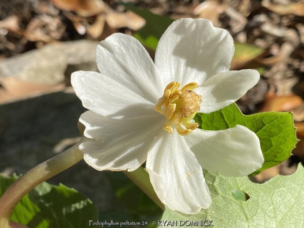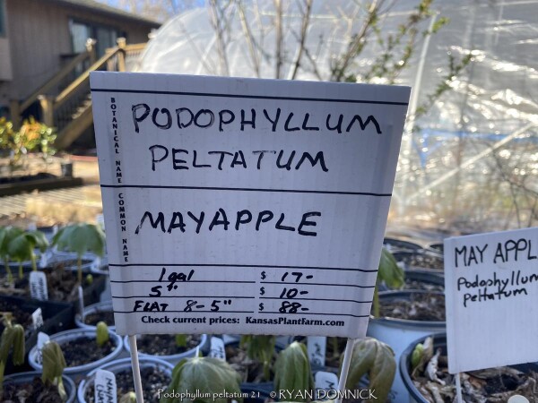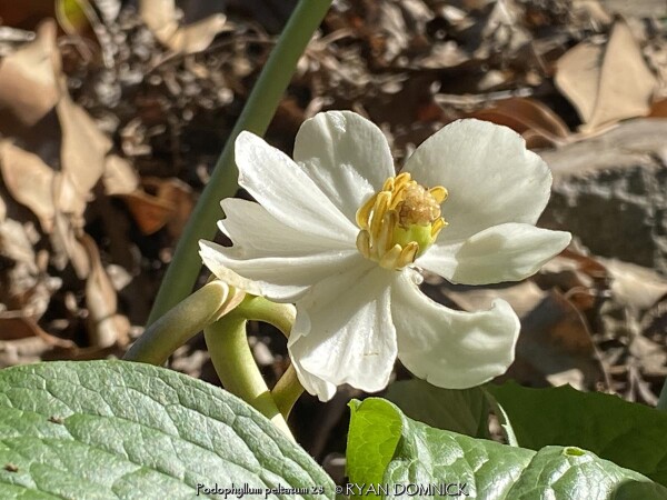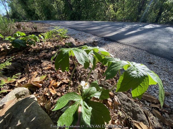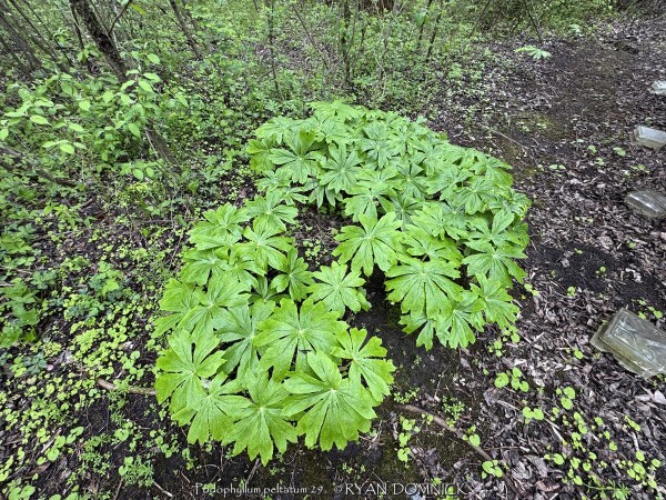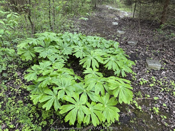 Mayapple (Podophyllum peltatum) is a spring growing perennial with large green umbrella like leaves. White five petal flowers appear on mature plants with green "apple-like" fruits to follow. Mayapple is native to rich woodland areas in Kansas, the Midwest, and most of the eastern United States; it needs rich well-drained soils. Mayapple colonizes by rhizomes forming dense slow-spreading mats making this an easy plant to spot from a distance especially in the early spring. Early spring emergence is normally not a problem as foliage resists normal spring frosts. During the April deep freeze of 2007 in Lawrence, KS, temperatures bottomed out at 18°F after an extra warm March. As a comparison, hosta foliage had completely unfurled was killed to the ground but Mayapple foliage had no damage for several days of the cold blast with temperatures down to 22-24°F! Moderate damage occurred on the last night at 18°F but no long term problems persisted. After summer heat and drought sets in usually by mid June, the foliage disappears completely going dormant until the next spring. Because it goes dormant, summer drought is usually not a problem as long as soil is rich in organic matter and moisture-retentive. Fruit-set is uncommon as vegetative growth is the primary method of propagation. A single-leafed stem will not produce a flower that season. A forked stems bearing two leaves will have a tight flower bud nestled at the base of the two petioles and possible fruit if pollinated. Bees seem to do this work, especially queen bumble bees. Blooms occur at a time of year when other pollen sources are rare thus being very valuable for wild-life. Fruit is sweet and edible, however with caution. Usually one or two fruits is safe but toxic if eaten in larger quantities. Usually, raccoons or possums get to the fruit before humans. This native perennial gives a tropical vibe and is valuable for the early spring foliage, flower, and fruit but be prepared for a bare spot during the rest of summer unless you fill in with summer annuals, late emerging perennials, or mulch to stop weed growth.