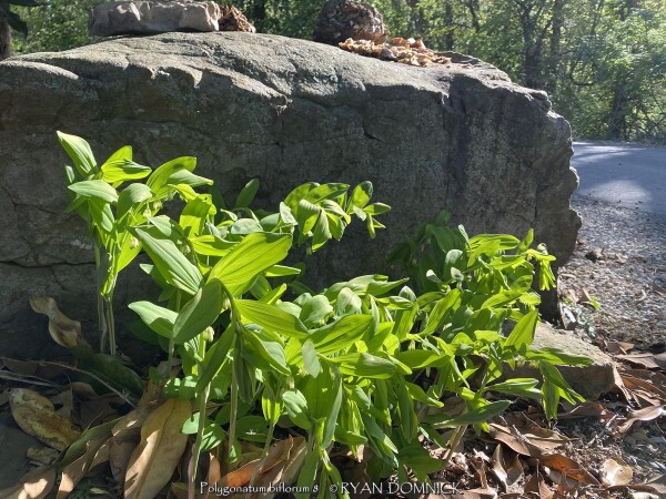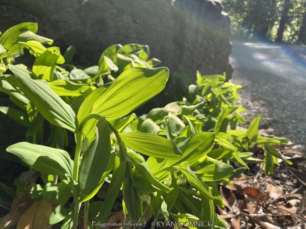 Solomon Seal (Polygonatum sp.) is a very large genus of perennials comprising dozens of species. Many of the species that are appropriate for garden use in Kansas are native to seasonally dry to moist forests in North America and Asia. New growth arises each year from a finger-like slowly spreading rhizome system. The foliage has a central stem with architecturally arranged opposite leaves covering the length of the stem gradually getting smaller towards the end. Small bell-shaped white flowers appear in early spring followed by bluish-purple fruit. Flowers and new spring growth is frost-hardy. Most Solomon seals do well with average garden soils and moisture with many tolerating dry-shade well. Solomon's seal can grow for many years increasing in density without ever needing division. Over time this creates a nearly weed-proof groundcover. in eastern Kansas with 40 inches of rain per year on average, there seems to be plenty of moisture to create extremely healthy patches of Solomon seal that compete well with tree roots. While some species can tolerate sun, there are many better choices as sunburning will likely occur with afternoon sun in temperatures over 95 degrees F. Combine with hostas or other shade plants to create a dramatic effect. Included in our "edibles" database but depends on how hungry you are! Polygonatum biflorum, also known as Smooth solomon's-seal, is native to Kansas and Central U.S. forests in average to moist conditions including dry-shade. It adds a bright splash of light green to the shade garden. Fruiting does occur and desirable self-seeding occurs within the patch. Plants reach heights of 18-24" tall in Kansas. Fall color is a brilliant yellow for a week before going dormant. Maintenance is easy as stems easily detach when raking with fall clean-up. If cosmetic foliage leaf-rust is a problem, just cut back early. During the April deep freeze of 2007, temperatures bottomed out at 18°F after an extra warm March. Hosta and Solomon seal foliage had completely unfurled and was flowering. All hostas were killed to the ground but solomon seal foliage and flowers survived un-damaged! A great "Once it's there, it's there forever" plant for dry-shade!