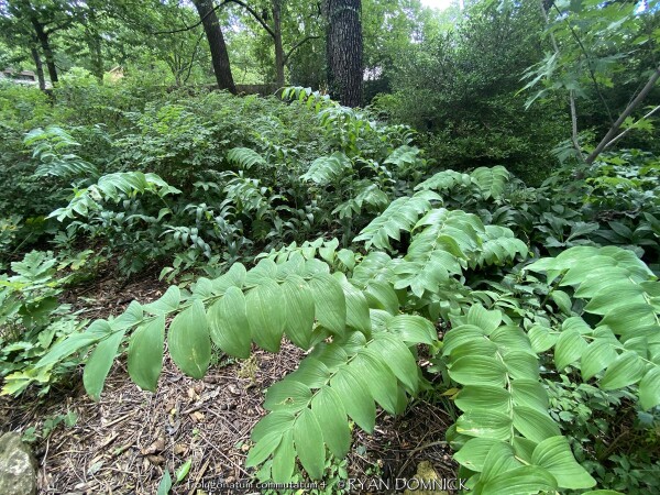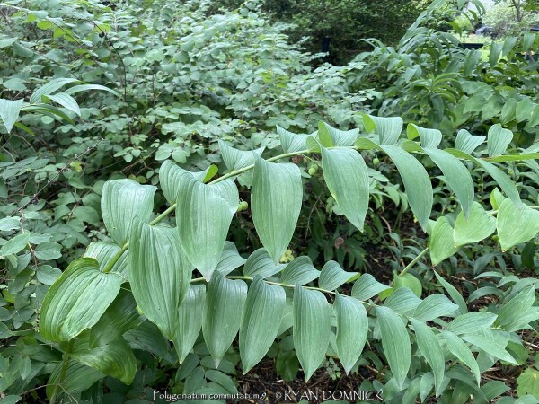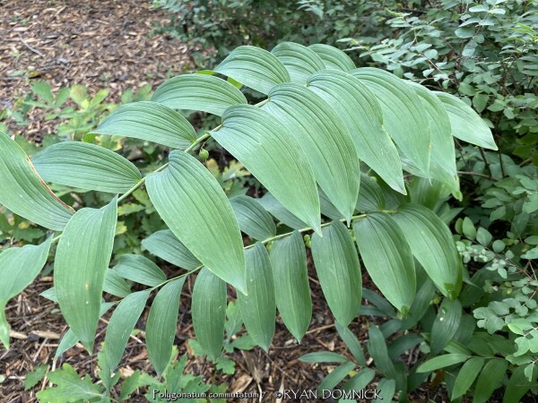 Solomon Seal (Polygonatum sp.) is a very large genus of perennials comprising dozens of species. Many of the species that are appropriate for garden use in Kansas are native to seasonally dry to moist forests in North America and Asia. New growth arises each year from a finger-like slowly spreading rhizome system. The foliage has a central stem with architecturally arranged opposite leaves covering the length of the stem gradually getting smaller towards the end. Small bell-shaped white flowers appear in early spring followed by bluish-purple fruit. Flowers and new spring growth is frost-hardy. Most Solomon seals do well with average garden soils and moisture with many tolerating dry-shade well. Solomon's seal can grow for many years increasing in density without ever needing division. Over time this creates a nearly weed-proof groundcover. in eastern Kansas with 40 inches of rain per year on average, there seems to be plenty of moisture to create extremely healthy patches of Solomon seal that compete well with tree roots. While some species can tolerate sun, there are many better choices as sunburning will likely occur with afternoon sun in temperatures over 95 degrees F. Combine with hostas or other shade plants to create a dramatic effect. Included in our "edibles" database but depends on how hungry you are! Polygonatum commutatum, also known as Great Solomon's seal, is native to Eastern U.S. forests in average to moist conditions. It adds a bright splash of light green to the shade garden. Fruiting does occur and desirable self-seeding occurs within the patch. Plants reach heights of 24-36" tall in Kansas. Fall color is a brilliant yellow for a week before going dormant. Maintenance is easy as stems easily detach when raking with fall clean-up. If cosmetic foliage leaf-rust is a problem, just cut back early. During the April deep freeze of 2007, temperatures bottomed out at 18°F after an extra warm March. Hosta and Solomon seal foliage had completely unfurled and was flowering. All hostas were killed to the ground but solomon seal foliage and flowers survived un-damaged! A great "Once it's there, it's there forever" plant for dry-shade!