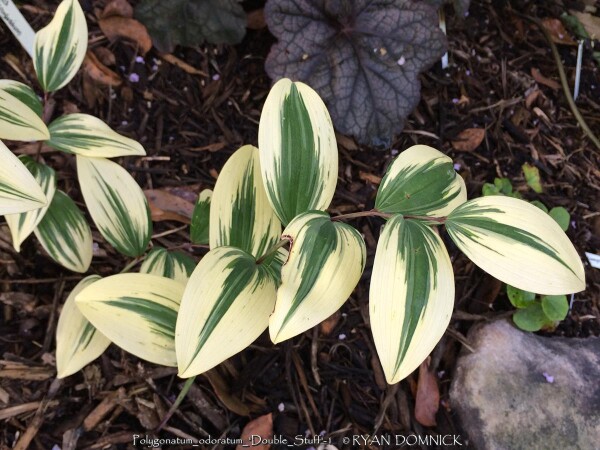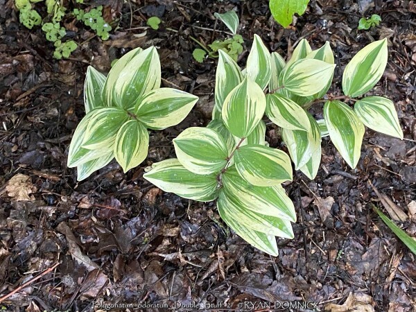 Solomon Seal (Polygonatum sp.) is a very large genus of perennials comprising dozens of species. Many of the species that are appropriate for garden use in Kansas are native to seasonally dry to moist forests in North America and Asia. New growth arises each year from a finger-like slowly spreading rhizome system. The foliage has a central stem with architecturally arranged opposite leaves covering the length of the stem gradually getting smaller towards the end. Small bell-shaped white flowers appear in early spring followed by bluish-purple fruit. Flowers and new spring growth is frost-hardy. Most Solomon seals do well with average garden soils and moisture with many tolerating dry-shade well. Solomon's seal can grow for many years increasing in density without ever needing division. Over time this creates a nearly weed-proof groundcover. in eastern Kansas with 40 inches of rain per year on average, there seems to be plenty of moisture to create extremely healthy patches of Solomon seal that compete well with tree roots. While some species can tolerate sun, there are many better choices as sunburning will likely occur with afternoon sun in temperatures over 95 degrees F. Combine with hostas or other shade plants to create a dramatic effect. Included in our "edibles" database but depends on how hungry you are! Double Stuff Variegated Solomon's Seal (Polygonatum odoratum 'Double Stuff') grows very slowly and is too weak to be sustainable in our garden: it is only included in our library as an interesting improved variegated type.