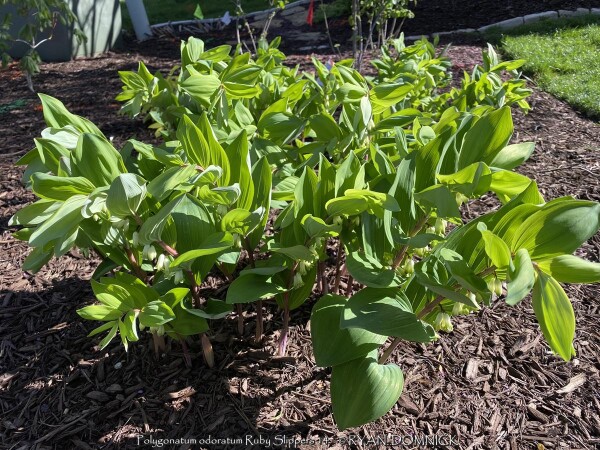 Solomon Seal (Polygonatum sp.) is a very large genus of perennials comprising dozens of species. Many of the species that are appropriate for garden use in Kansas are native to seasonally dry to moist forests in North America and Asia. New growth arises each year from a finger-like slowly spreading rhizome system. The foliage has a central stem with architecturally arranged opposite leaves covering the length of the stem gradually getting smaller towards the end. Small bell-shaped white flowers appear in early spring followed by bluish-purple fruit. Flowers and new spring growth is frost-hardy. Most Solomon seals do well with average garden soils and moisture with many tolerating dry-shade well. Solomon's seal can grow for many years increasing in density without ever needing division. Over time this creates a nearly weed-proof groundcover. in eastern Kansas with 40 inches of rain per year on average, there seems to be plenty of moisture to create extremely healthy patches of Solomon seal that compete well with tree roots. While some species can tolerate sun, there are many better choices as sunburning will likely occur with afternoon sun in temperatures over 95 degrees F. Combine with hostas or other shade plants to create a dramatic effect. Included in our "edibles" database but depends on how hungry you are! Ruby Slippers Solomon's Seal (Polygonatum odoratum 'Ruby Slippers') adds a bright splash of light green foliage and ruby-red stems to the shade garden. Height is uniformly 18-24" tall. Fall color is a brilliant yellow for a week before going dormant. Maintenance is easy as stems easily detach when raking with fall clean-up. A great "Once it's there, it's there forever" plant for dry-shade!