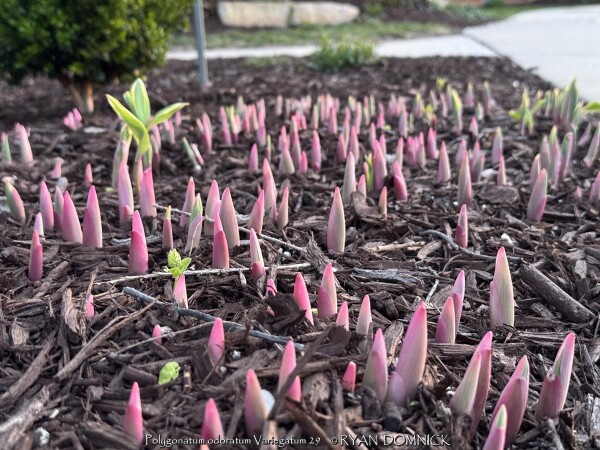 Solomon Seal (Polygonatum sp.) is a very large genus of perennials comprising dozens of species. Many of the species that are appropriate for garden use in Kansas are native to seasonally dry to moist forests in North America and Asia. New growth arises each year from a finger-like slowly spreading rhizome system. The foliage has a central stem with architecturally arranged opposite leaves covering the length of the stem gradually getting smaller towards the end. Small bell-shaped white flowers appear in early spring followed by bluish-purple fruit. Flowers and new spring growth is frost-hardy. Most Solomon seals do well with average garden soils and moisture with many tolerating dry-shade well. Solomon's seal can grow for many years increasing in density without ever needing division. Over time this creates a nearly weed-proof groundcover. in eastern Kansas with 40 inches of rain per year on average, there seems to be plenty of moisture to create extremely healthy patches of Solomon seal that compete well with tree roots. While some species can tolerate sun, there are many better choices as sunburning will likely occur with afternoon sun in temperatures over 95 degrees F. Combine with hostas or other shade plants to create a dramatic effect. Included in our "edibles" database but depends on how hungry you are! Variegated Solomon's Seal (Polygonatum odoratum 'Variegatum') adds a bright splash of light green and cream color to the shade garden. Fruiting does not occur on this variety like others. Height is uniformly 18-24" tall. Fall color is a brilliant yellow for a week before going dormant. Maintenance is easy as stems easily detach when raking with fall clean-up. During the April deep freeze of 2007, temperatures bottomed out at 18°F after an extra warm March. Hosta and Solomon seal foliage had completely unfurled and was flowering. All hostas were killed to the ground but solomon seal foliage and flowers survived un-damaged! A great "Once it's there, it's there forever" plant for dry-shade!