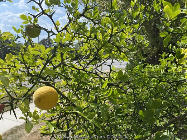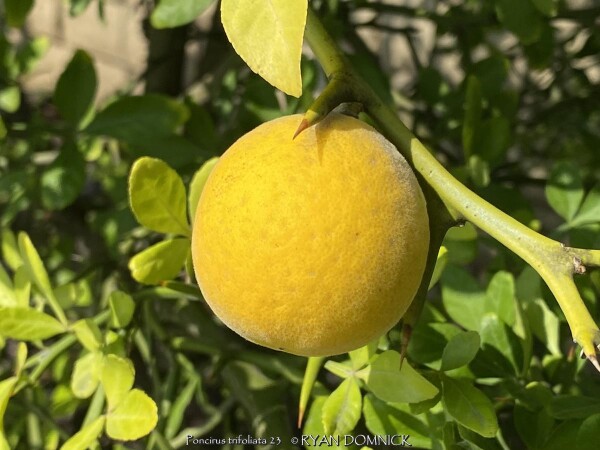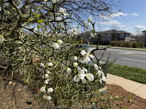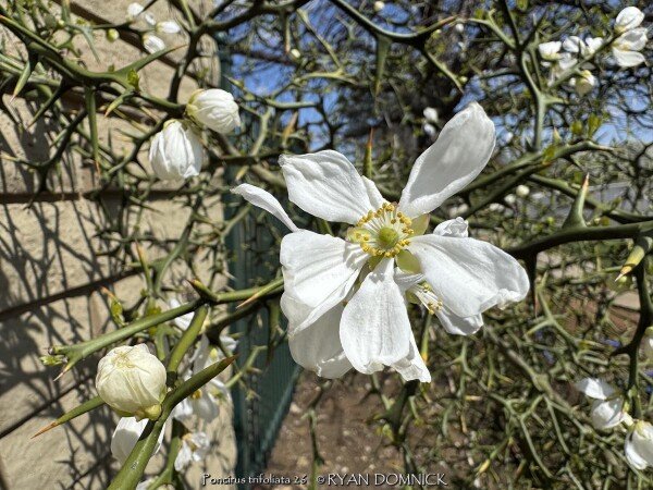 Hardy Orange (Poncirus trifoliata) makes an extremely architectural, well-branched, deciduous shrub with numerous thorns reminding me of the Sleeping Beauty Thorn Forest. One of the hardiest close relative of Citrus, Poncirus trifoliata in native to China and Korea. Hardy Orange makes an excellent privacy hedge for background areas away from foot traffic. Although deciduous, plants grow so dense that is virtually impenetrable. Also effective as an accent specimen in the sense of being an interesting and unusual. The root stock is used for grafting in the citrus industry. Growth requirements are simple; plant in almost any soil in full sun to full shade. As for ornamental qualities, these shrubs are covered with aromatic white flowers in spring followed by "edible" green fruits that turn yellowish orange by fall. Fruits of this citrus relative are edible with a strong lemony flavor but are very acidic and seedy. Fruits can used to make marmalade or left on the shrub where they persist well into winter providing significant ornamental interest. Growth is more open in shade with less flowering and fruits. It survived -16 degrees F and a week of single digit highs in February, 2021 after regrowing from the ground. Oklahoma State University in Stillwater, OK once had dozens of sidewalks lined with trifoliate orange pruned into long perfectly shaped 4'x4' rectangular cuboid. The woody growth was so dense that one could stand on top of this hedge; I personally witnessed this with amazement.
