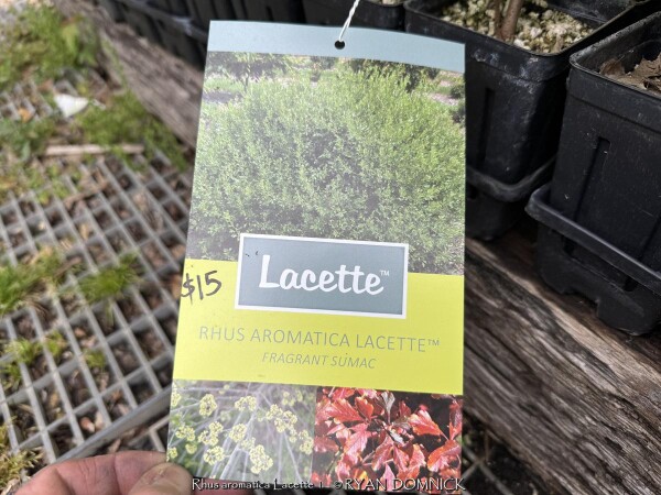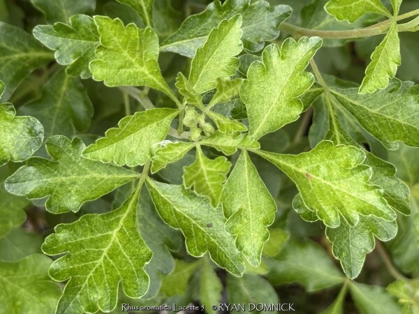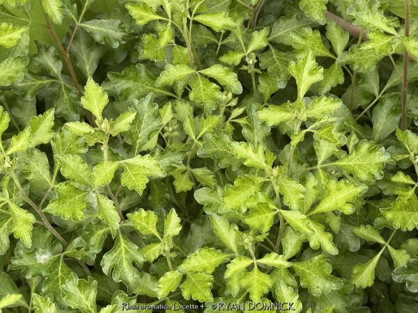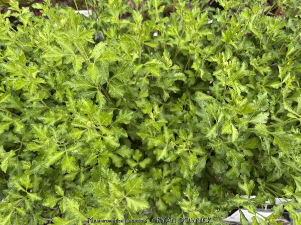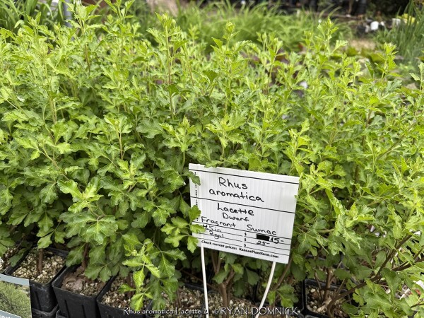 Gro-low sumac (Rhus aromatica 'Lacette') is a dwarf spreading cultivar of Rhus aromatica native to much of the central United States including Kansas. It differs from "Gro-low' with its fine textured leaves. It features bright foliage that turn brilliant red in the fall. Light yellow flowers and occasional red berries are also ornamental features. This sumac is commonly grown as a spreading groundcover shrub for difficult areas. It will grow in full sun or full shade in medium to dry soils including dry-shade. However, fall color is quite a bit reduced in full shade. In the landscape, it is commonly used as large mass planting on hills. Because of its tolerance for adverse conditions including poor soil and rock, it is often one of the last resort plants that will survive in certain areas. It competes well under large shade trees and helps absorb leaf litter allowing it to break down and add nutrients back to the soil. It is important to keep on the dry side to discourage root rot disease. This plant also does well in hot dry parking lot islands or along busy roads. Plants adapt well to hot south or west sides of the house enduring temperatures of over 100 degrees F with no foliage burn. Plants can also be planted on the north side of a house being extremely cold hardy with no winterkill. Another great spot is planting on top of a retaining wall allowing it to cascade down. We do not recommend planting in small areas or in spaces that it will overrun neighboring plants. Unlike other sumac, it only spreads above ground as horizontally growing stems touch the ground and root. This does make maintenance easier to control the spread of the plant versus digging out rhizomes. Considered one of the most versatile and best plants for solving your most difficult landscape challenges.