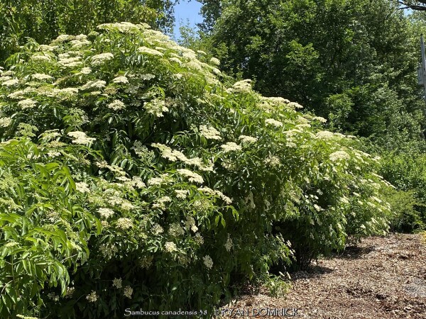 American Elderberry (Sambucus canadensis) is a large spreading shrub with interesting foliage, white flowers and deep purple blackberries. Elderberry is native to a large part of the US (Eastern Midwestern and Northern areas) including Kansas. Large white flower clusters attract bees and other kinds of pollinators for about a month in June. Decent growth will occur in both sun or full shade but growth is open and coarse textured either way. Flowering and fruiting will diminish with increasing shade but not go away completely. American elderberry tolerates a wide variety of wet to dry soils but prefers rich, moist, slightly acidic soil. Elderberry grows fastest and rich well drained soils but may become too fast and agressive. To slow down or eliminate this suckering tendency, plant in a more stressful sites such as dry shade, dry sunny areas, tight heavy clay soils, or non-irrigated areas. However, if you want absorbent amounts of fruit and spread, designate a large area with rich soil regular water in your garden. A favorite use in the landscape is filling the niche of a large flowering shrub in full shade. Elderberry also makes a great mass planting belong roadways or wild areas. Large flowers and copious amounts of fruit make this a great wildlife friendly plant. As you may have already heard, elderberries may be harvested and processed into an array of juices, syrups, and products with immune system stimulating qualities. The raw fruit should be boiled before eaten. Select cultivars have been produced with drastically increased fruit yields. Although self-fertile, more fruit set occurs with cross-polination