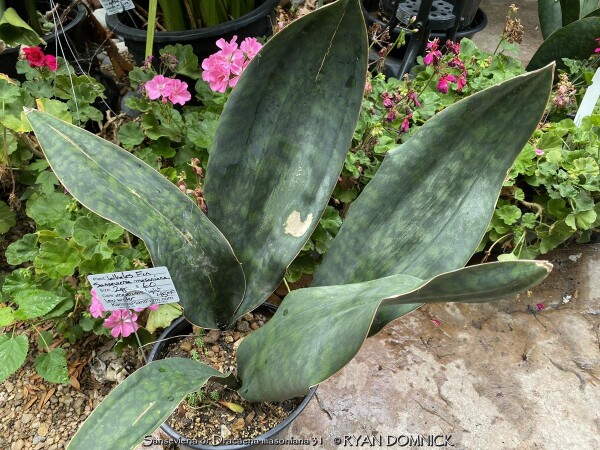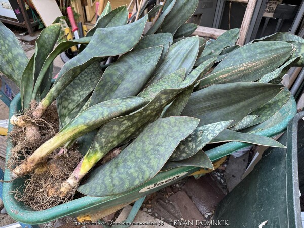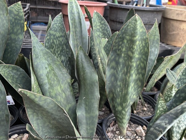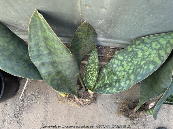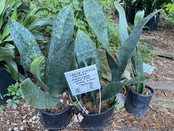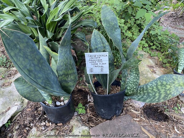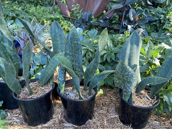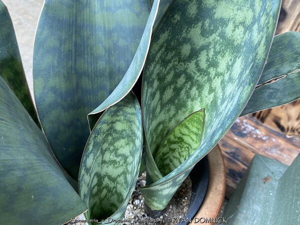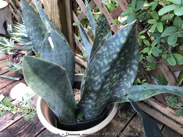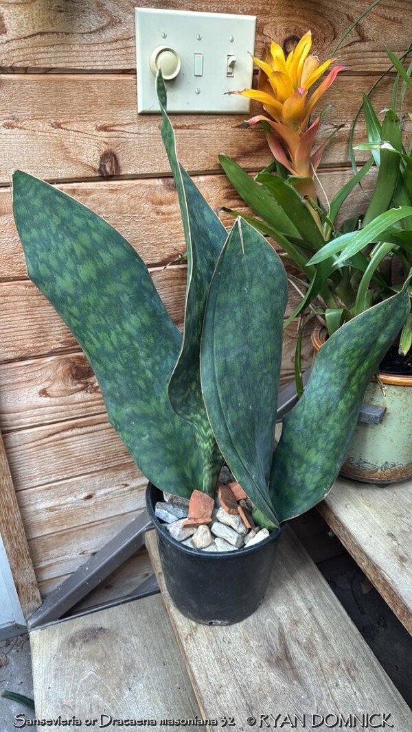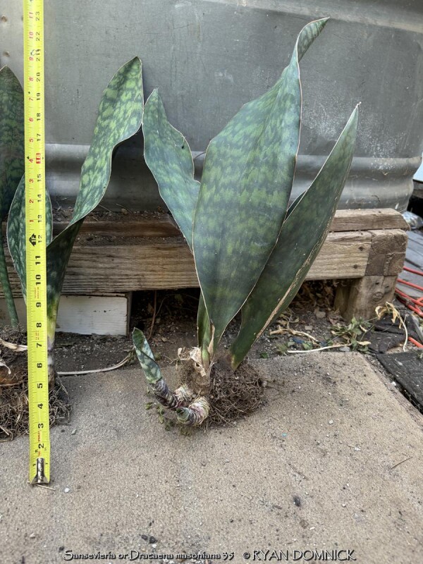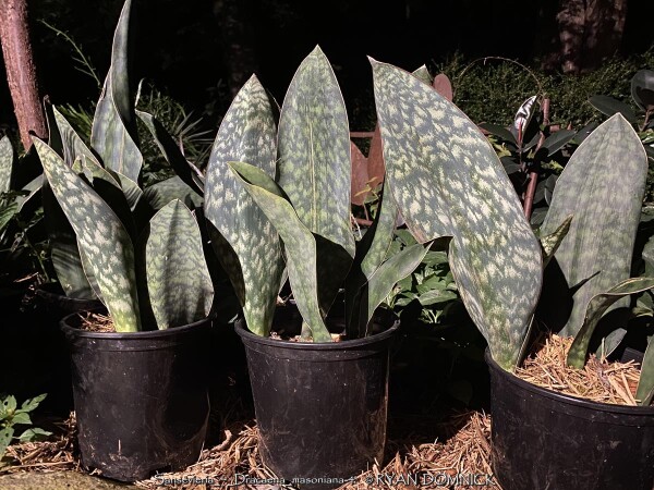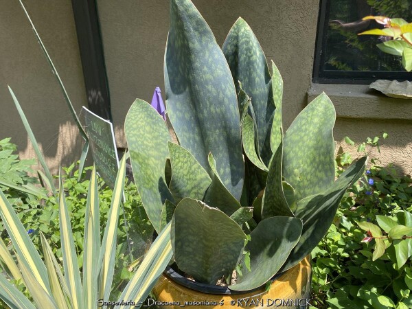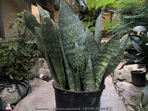 Extra wide blue-green speckled leaves from this Whale Fin Sansevieria (Sansevieria / Dracaena masoniana) make an excellent architectural statement. Most Sansevieria are native to are native to rocky, dry habitats in tropical Africa but used as a patio or house plant in Kansas. Grow in full sun to part sun with optional extra watering including that which comes from rainfall. Plants with plenty of time to acclimate will thrive in full sun but be careful not to rush it or sunburning will occur. Generally if moving outside for the summer, allow 2-3 weeks of part shade or morning sun before placing in full sun. Or just keep in part shade or under an overhang. Repotting may or may not be needed depending on how large you want the plant to grow; plants can continue to grow and tolerate extremely root-bound pots but may need wind bracing. Some species root systems will build up enough pressure and will simply break the pot as a friendly reminder when it's time to re-pot! Protect from temperatures below 45 degrees F and move into a bright window over the winter with no watering. Do not allow Sansevieria to freeze or even get close to freezing especially if soil is wet or death may occur. As a winter house plant, it will look presentable all winter long with just a few monthly or no waterings if you forget. As a permanent house plant, provide bright light and allow the soil to dry between waterings for many years of carefree enjoyment. Potted plants are very low maintenance needing only old leaves trimmed once per year. Whale Fin Sansevieria is one of the more slow-growing and most sought-after snake plants often grown as a specimen house plant. Largest leaves of all sansevierias! Whale Fin is rare and will command a higher price than most other houseplants.
