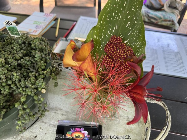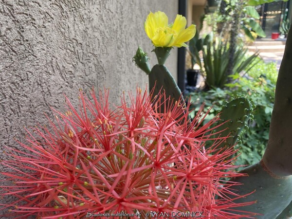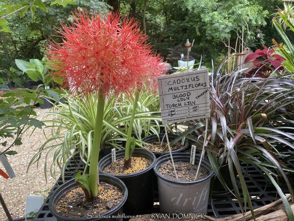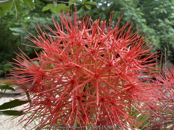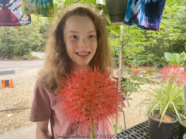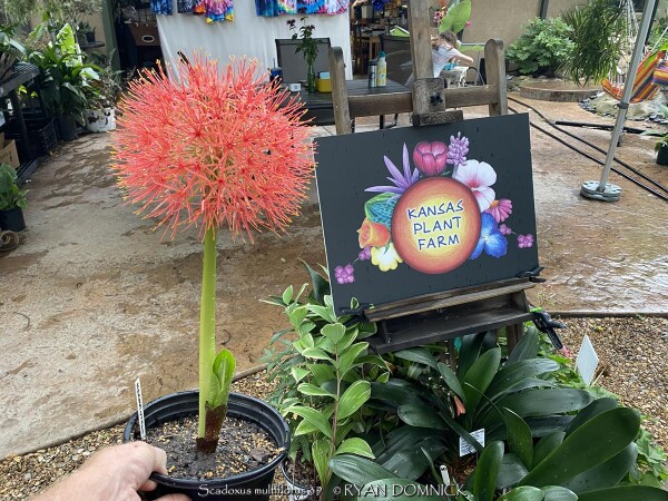 Jaw-dropping flowers! African Blood Lily (Scadoxus multiflorus) produces a mass of tiny florets with prominent stamens clustered in one large, orange-red, softball-sized, bottlebrush, round flower. It is so eye-catching it wins a place in many summer gardens. Reminds me of a giant red dandelion seed head! This South African native is 8"-10" tall and provides bright color in the late summer garden. Bold, broad green leaves emerge after the flowering is over. Although it is said to need partial shade, we have this pest resistant, adaptable plant happily blooming in full sun; blooms mid-summer. Winter hardiness: zones 7/8-10. Plant bulb outside as an annual before flowering: planting already flowered bulbs is not recommended unless you dig it up for winter storage. If grown as a potted plant, bring container indoors and either grow them as a houseplant in a lighted area. Foliage will look good for a few months before finally dying back. Eventually allow bulb to go dormant stopping the water and store bulbs dry in the container with soil anywhere between 40-70 degrees F. African Blood Lily will bloom year after year when grown as a potted plant; late to emerge in the spring so don't throw it out! It is possible to overwinter these in the ground in Kansas by placing a giant 12" mound of mulch over deeply planted bulbs. New growth will usually be delayed until late May/early June but quickly regains full height. In our trial gardens in Lawrence, KS (zone 6a), a bulb planted over 8" deep and next to a South-facing brick wall with 6-8" of leaf mulch survived -17 degrees F. During the arctic blast of February, 2021, lows down to -17 degrees F on Feb 16th, 2021 were recorded. The longevity of this cold blast was also impressive: 10 days on a row with highs of 10-15 degrees F or lower, 8 nights of lows in the single digits and negatives, and 36 straight hours of 0 degrees F and mostly lower.