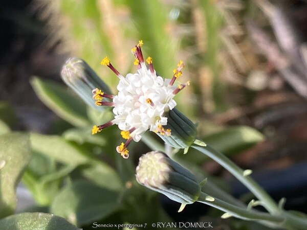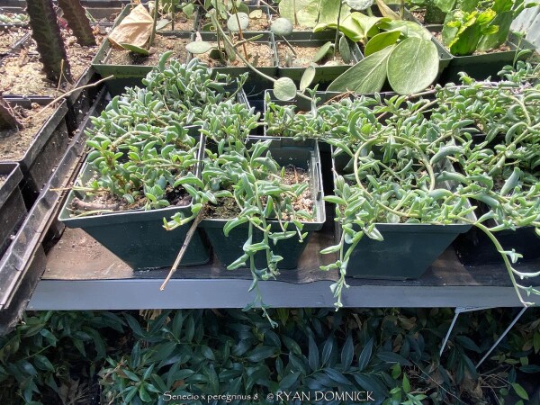 String of Dolphins (Senecio / Curio x peregrinum) grows long green stems with interesting dolphin-shaped alternating leaves. They are usually grown as a patio or house plant in Kansas. String of Dolphins also grow well in hanging baskets as a durable, succulent plant able to survive drying out, heat and dry air like few others! To play is safe, potted plants are best moved in before night temperatures get below 45 degrees F. It is important to avoid the combination of wet and cold. Before extreme cold occurs, move to a bright interior window over the winter with no watering and keep above freezing. As a winter house plant, it will look presentable all winter long with just no waterings. As a permanent house plant, provide bright light and allow the soil to dry between waterings for many years of carefree enjoyment. Generally if moving outside for the summer, allow 1-2 weeks of part shade or morning sun before placing in full sun. Plants with time to acclimate will thrive in full sun but be careful not to rush it or sunburning will occur. Full hot sun over 100 degrees F can also burn the top of the hanging basket killing the stems where they touch the pot rim and dirt. Avoid this by moving into part-shade during the hottest part of the summer. Potted plants are very low maintenance. I have never seen any insect problems on this plant.