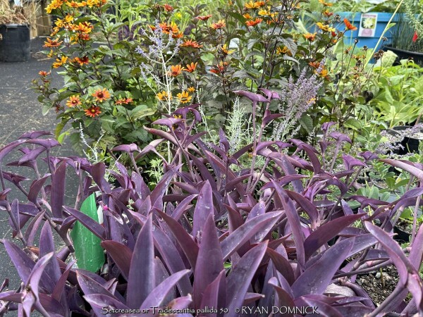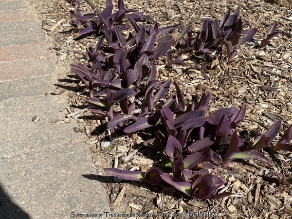 Purple Heart (Setcreasea / Tradescantia pallida 'Purple Heart') is the most versatile plant in out library: it can be an annual, perennial, patio plant, house plant, or hanging basket in wet or dry soil in full shade or full sun. It can handle growing in standing water or bone dry. In dry soils, it shows no drought stress, continuing to grow with a deeper purple shade. In moist soils, this plant will grow rapidly. In shade, the foliage becomes more greenish but still looks attractive. In Kansas, it is usually grown as an annual. Brilliant purple leaves contrast small pink flowers in the summer! Plants will quickly fill an annual bed with bright purple color all summer til first hard freeze. In the ground, it is possible to overwinter these in the ground in Kansas by placing a 6-8" mound of mulch over deeply planted rhizomes. Not sure what's easier, buying and moving that much mulch or replanting in spring?: you decide. If growing as a potted plant and trying to overwinter, allowing the foliage to frost is ok, it will not kill the root system. However, do not allow the pot with rootball to freeze solid or go below 20 degrees for more than a few hours. Allow to go dormant as needed with little care, just cut off dead foliage and place back out in April or May with a time-release fertilizer. Many plants will die back slowly and remain attractive inside for most of the winter. Purple heart plants have no insect, disease or animal pests. Botanical name has recently changed from Setcreasea to Tradescantia. A variegated form is also available. This plant survived in our Lawrence, KS display garden down to -16 degrees F and a week of single digit highs in February, 2021 with mulch.