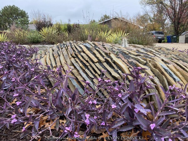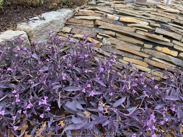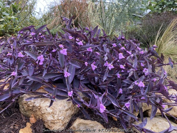 Purple Heart (Setcreasea / Tradescantia pallida 'Purple Heart') is the most versatile plant in out library: it can be an annual, perennial, patio plant, house plant, or hanging basket in wet or dry soil in full shade or full sun. It can handle growing in standing water or bone dry. In dry soils, it shows no drought stress, continuing to grow with a deeper purple shade. In moist soils, this plant will grow rapidly. In shade, the foliage becomes more greenish but still looks attractive. In Kansas, it is usually grown as an annual. Brilliant purple leaves contrast small pink flowers in the summer! Plants will quickly fill an annual bed with bright purple color all summer til first hard freeze. In the ground, it is possible to overwinter these in the ground in Kansas by placing a 6-8" mound of mulch over deeply planted rhizomes. Not sure what's easier, buying and moving that much mulch or replanting in spring?: you decide. If growing as a potted plant and trying to overwinter, allowing the foliage to frost is ok, it will not kill the root system. However, do not allow the pot with rootball to freeze solid or go below 20 degrees for more than a few hours. Allow to go dormant as needed with little care, just cut off dead foliage and place back out in April or May with a time-release fertilizer. Many plants will die back slowly and remain attractive inside for most of the winter. Purple heart plants have no insect, disease or animal pests. Botanical name has recently changed from Setcreasea to Tradescantia. A variegated form is also available. This plant survived in our Lawrence, KS display garden down to -16 degrees F and a week of single digit highs in February, 2021 with mulch.