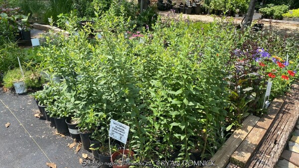 Fireworks Goldenrod (Solidago rugosa 'Fireworks') is the most garden-worthy of the goldenrods! It features dark green upright foliage. As the flower panicle matures, the expanding buds create a fine-textures cloud-like effect for about a month before the flowers open. When the flowers finally open in September, the radiating form really looks like fireworks! After flowering, the dried flower structure holds up well into fall offering winter interest until the first wet heavy snow. The species, Solidago rugosa, is native to the eastern and central parts of the United States and Canada. It is a highly adaptable goldenrod occuring in open moist areas such as low woods, meadows, old fields, pine barrens, and bogs. It is more tolerant of wet soils that other goldenrod. It prefers locations in full sun in average to moist soils that are well-drained but is adaptable to part shade or dappled shade. In Eastern Kansas, typically our 40 inches of rainfall is sufficient without extra water if planted in good soils. During the drought years in Eastern Kansas of 2011 and 2012, many Fireworks Goldenrods planted in landscapes that were not watered survived but dried up as flowers were trying to form. Goldenrods are not wind-pollinated and therefore do not cause standard hay fever or allergies. This goldenrod attracts wide variety of insects, including small bees, wasps, flies, small butterflies. Rabbit and deer resistance is good. The slowly expanding clump is virtually maintenance free, only needing trimmed in fate fall. Fireworks Goldenrod is generally very pest and disease resistant and can spread by creeping rhizomes or seed. Fireworks Goldenrod has been planted in our trial gardens over 18 years in mostly full sun with average garden soil. This is among our favorite perennials with truely 4 seasons of interest!