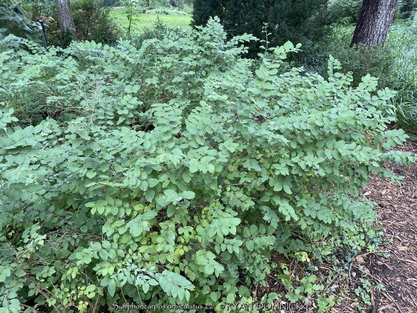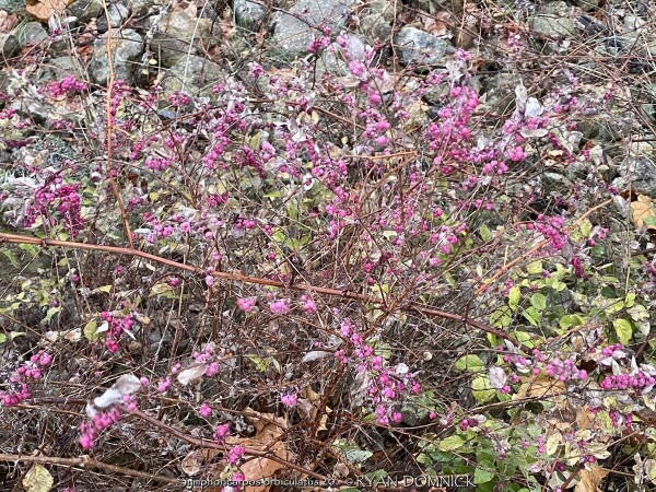 Coralberry (Symphoricarpos orbiculatus) is a spreading dwarf shrub native to much of the central and eastern United States including Kansas. It features mint green leaves that remain attractive all summer. Light pink flowers are barely noticeable but attractive upon close inspection. Ornamental clusters of magenta berries in the fall are the main attraction! The berries are very freeze-hardy clinging onto the leafless stems throughout most of the winter regardless of the minimum temperatures. This creates quite a show providing excellent color and interest to the winter landscape. While edible for some birds including robins, they seem to avoid the fruits unless it's a last resort. Coralberry is commonly grown as a spreading groundcover shrub for difficult areas. It will grow in full sun or full shade in medium to dry soils including dry-shade. It tolerates moist soil and floods for short periods of time. Fall leaf color is non-existent but ok because of the berry display. A brief window of time exists in the fall where the plant has beautiful green foliage and contrasting magenta berries at the same time. In the landscape, it is commonly used as large mass planting on hills. Because of its tolerance for adverse conditions including poor soil and rock, it is often one of the last resort plants that will survive in certain areas. It competes well under large shade trees and helps absorb leaf litter allowing it to break down and add nutrients back to the soil. This plant also does well in full sun; berry density is much greater in full sun. Plants can also be planted on the north side of a house, being extremely cold hardy with no winterkill. Another great spot is planting on top of a retaining wall allowing it to cascade down. We do not recommend planting in small areas or in spaces that it will overrun neighboring plants. It only spreads above ground as horizontally growing stems touch the ground and root. This does make maintenance easier to control the spread of the plant versus digging out rhizomes. Considered one of the best plants for solving your most difficult dry-shade landscape challenges.
