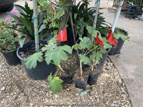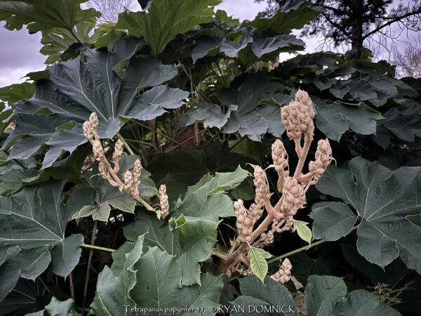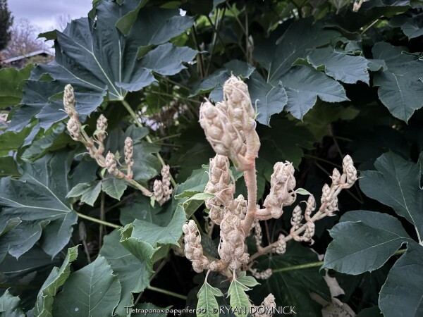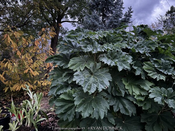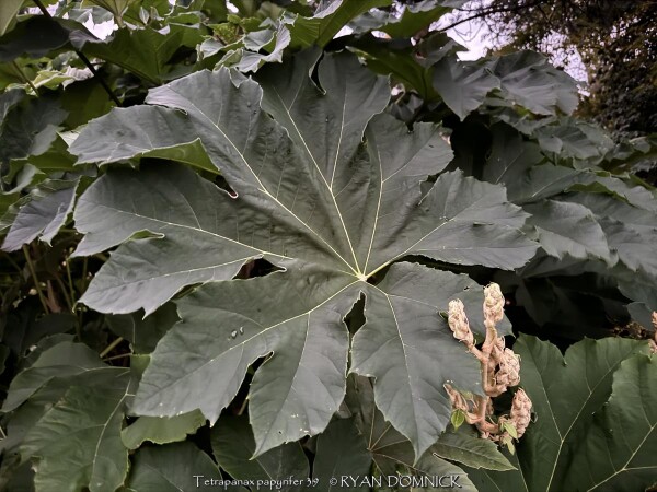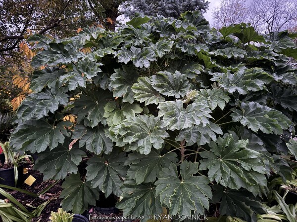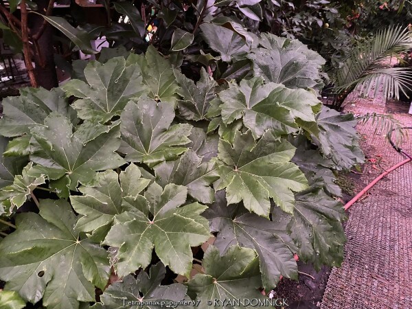 Rice Paper Plant (Tetrapanax papyrifer) is a hardy tropical with large palmate leaves up to 24" across. In warmer zones and in its native habitat in Taiwan, Tetrapanax is a large shrub or small tree with white flowers produced in the fall. However in our Lawrence Kansas zone 6a climate, Tetrapanax is killed down to the ground each year like crapemyrtles and butterfly bush. A thick mulch is appreciated when young but not needed on established plantings. Tetrapanax is not picky about soils or moisture but will display fastest growth in rich, moist, well-drained areas in full sun. Tetrapanax will also tolerate almost full shade when established. Because it spreads by rhizomes, be sure to allow plenty of space or have control methods in place. Generally, chopping off shoots as they emerge as easy enough. Another word of caution is that Tetrapanax contains a white powdery-like cottony substance on near stems and back sides of leaves. This can cause eye and throat irritation so be careful when cutting back to not rub off the dust (or do so up-wind). Tetrapanax is a very rare plant in cultivation but can also be seen at the Wichita botanical gardens, Botanica. There is a giant form called Tetrapanax papyrifer 'Steroidal Giant' available at Plant Delights Nursery in North Carolina with leaves up to 3 feet wide and less spreading but we have not been able to procure or establish this plant in our Lawrence, KS garden. In our trial gardens in Lawrence, KS (zone 6a), three established mulched specimens of Tetrapanax papyrifer have survived for over 10 years including -17 degrees F in 2021. During that arctic blast of February, 2021, lows down to -17 degrees F on Feb 16th, 2021 were recorded. The longevity of this cold blast was also impressive: 10 days on a row with highs of 10-15 degrees F or lower, 8 nights of lows in the single digits and negatives, and 36 straight hours of 0 degrees F and mostly lower. It can also be grown as a potted patio plant; move into a cold garage or basement over the winter with minimal watering. Allow to go dormant as needed with little care, just cut off dead foliage and place back out in April or May with a time-release fertilizer.