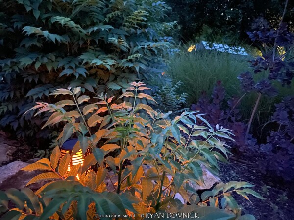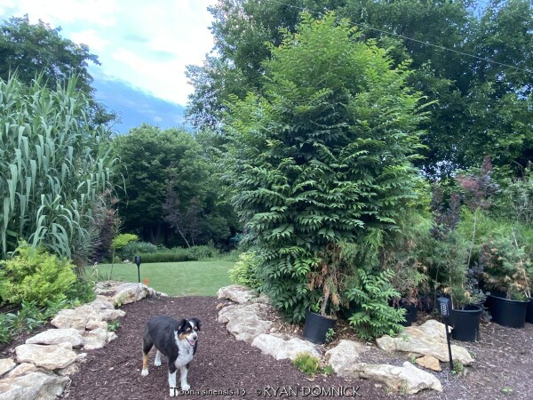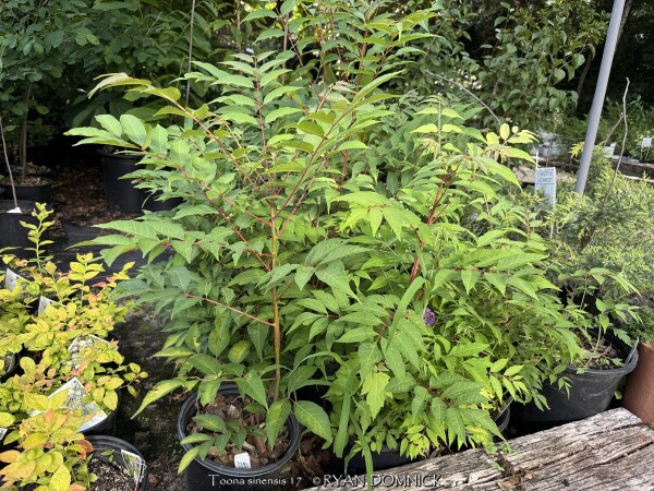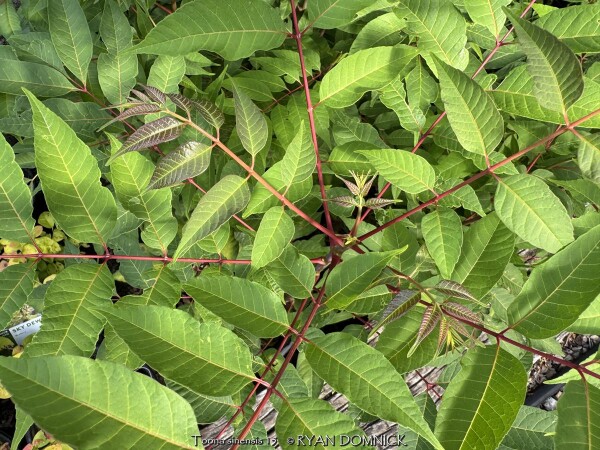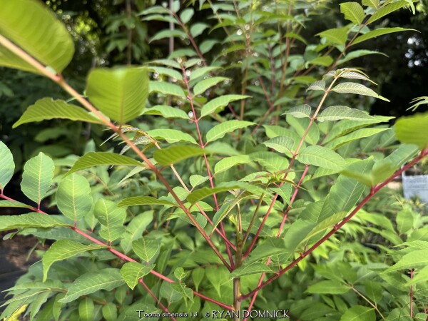 Chinese Toon (Toona sinensis) is a rare shrub-like tree from China in the mahogany family known for its edible leafy foliage. Foliage has an onion a flavor and can be eaten fresh or mixed into stir-fry vegetable recipes. When emerging in the spring, new foliage is a bright red to pink color and is enhanced by cooler weather in the spring. Bi-pinnate foliage deepens to a medium to dark green as it unfurls throughout the summer and has a strong resemblance in appearance to Tree of Heaven (Ailanthus altissima). Fall color is a gorgeous yellow lasting for a week or two. Chinese Toon is useful in the edible landscape as a "vegetable tree". Also very attractive in the landscape, it can form a background shrub, a specimen shrub, or a small colony. Grow in full sun and just about any well drained soil for best results. Although this grows into a "tree" in southern climates, it will typically freeze down to the ground each year in Lawrence Kansas. (zone 6a) The only maintenance is pruning winter-killed growth to the ground. New rapidly growing water sprout shoots will emerge by mid spring. New foliage is the most tasty to eat, so this works out great for harvesting when grown as a "vegetable tree". Chinese Toon can also be grown as a potted plant moved into a garage or dark basement: it doesn't seem to suffer from being root bound in a pot.